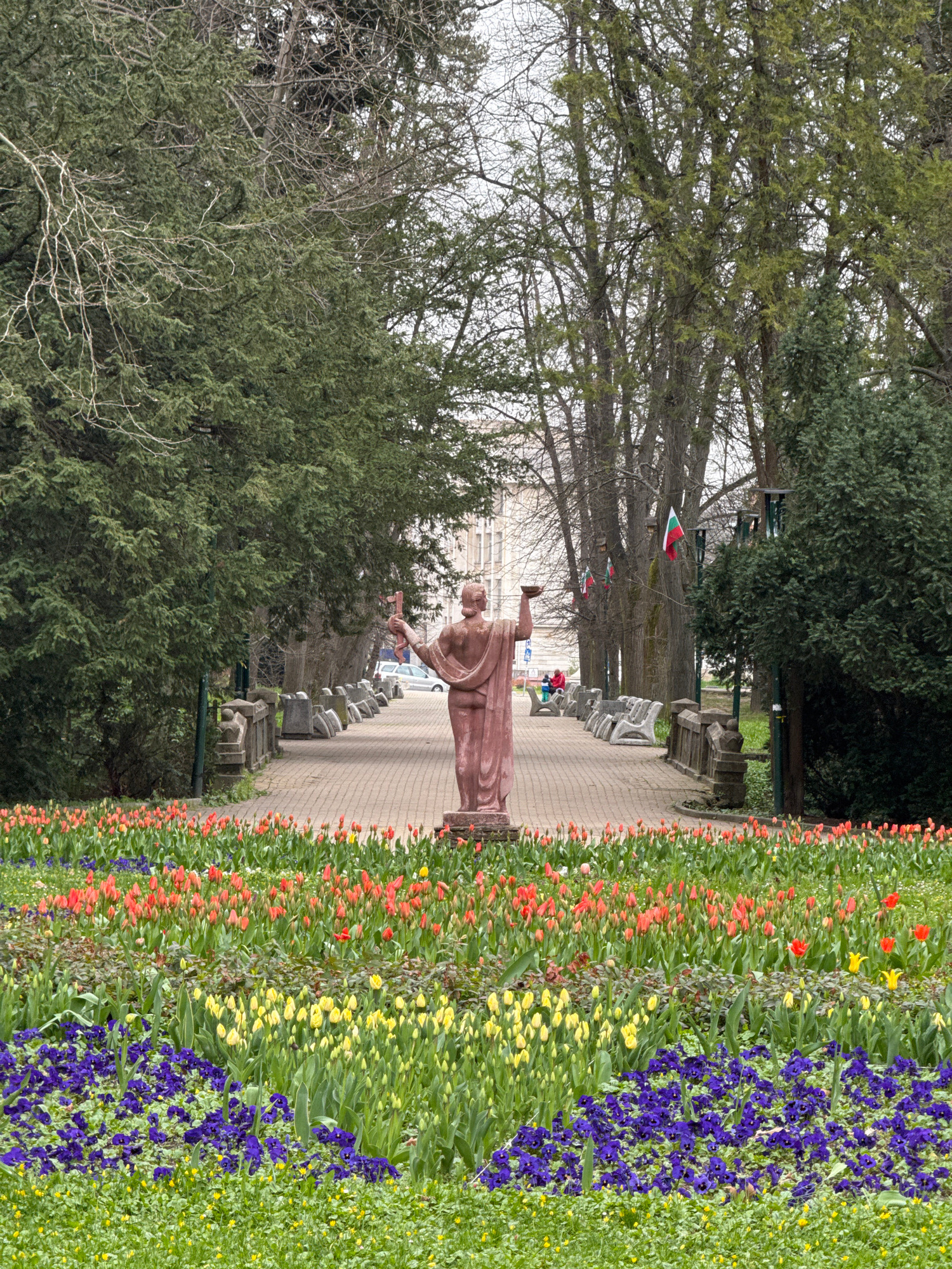 The image shows a statue in Bankya, Bulgaria. The statue is a reddish-brown color and depicts a person with arms outstretched. The statue is located in a park. There is a brick path alongside the stat…read more