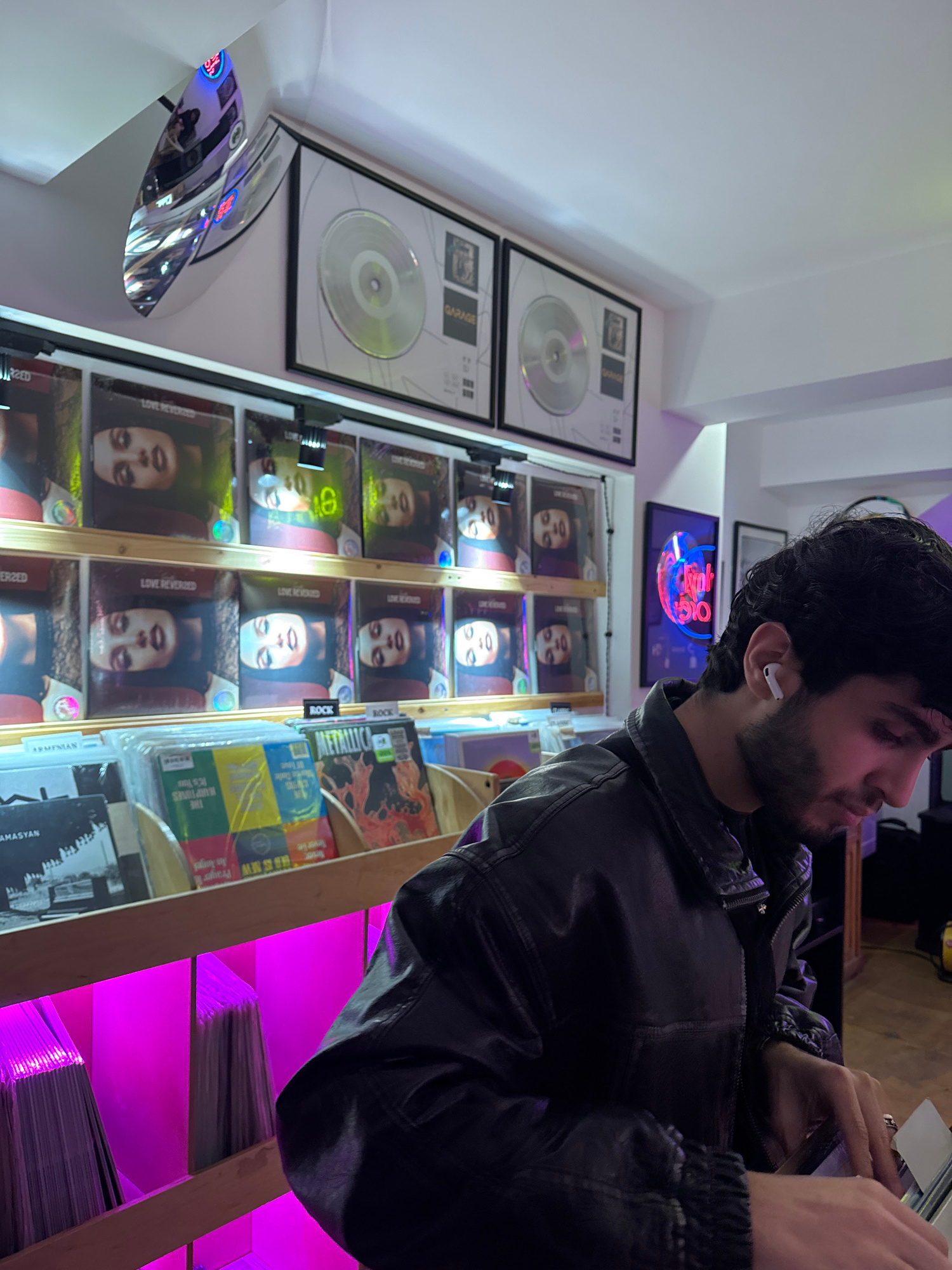 A man with dark hair and a beard, wearing a black leather jacket and an earbud in his left ear, is pictured in what appears to be a record store. Behind him are shelves displaying rows of vinyl record…read more