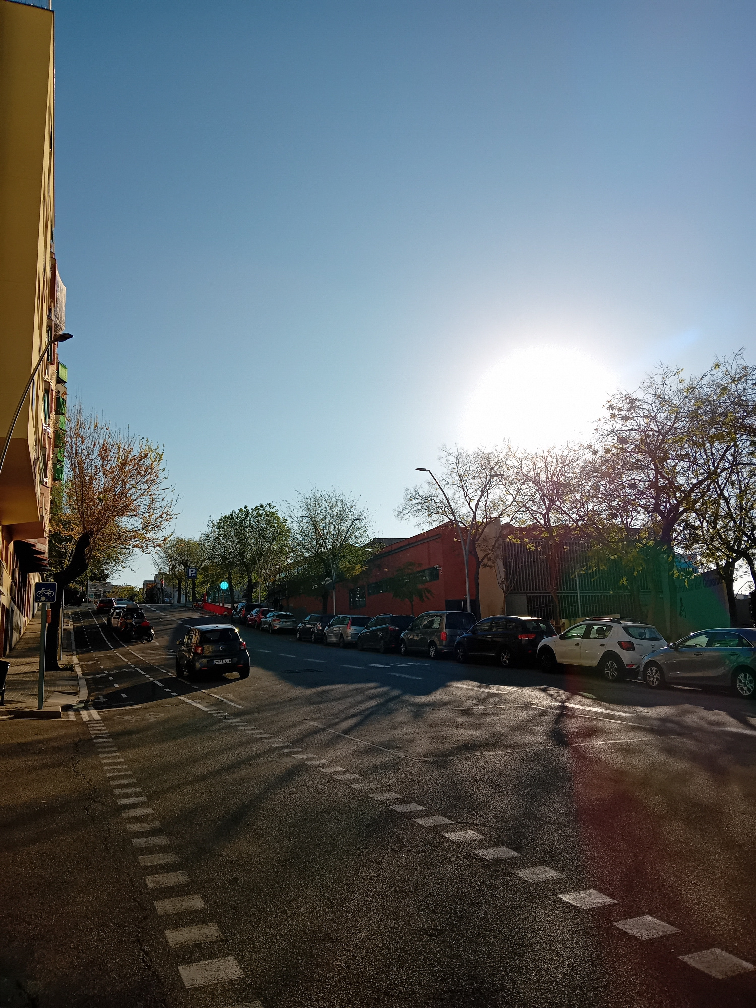 The image depicts a street scene in Barcelona, Spain. The perspective is tilted, showing a clear blue sky with a bright sun. Buildings with yellow and red facades line the left side of the street. A r…read more