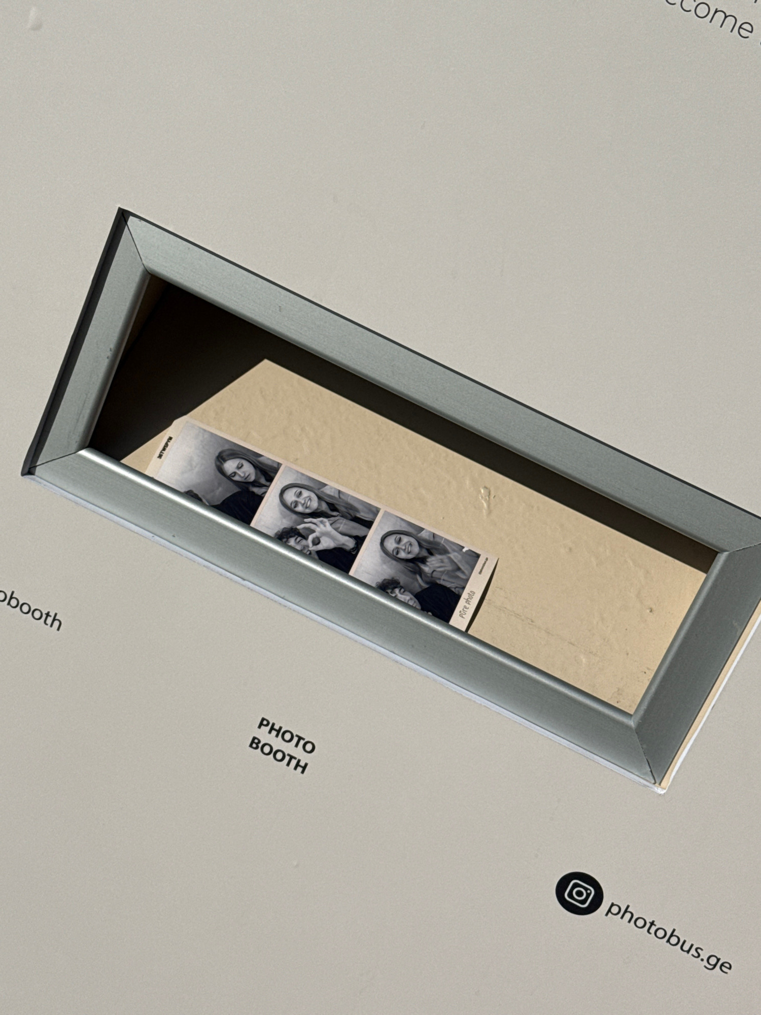 The image presents an angled, overhead view of what appears to be a photo booth display or output slot, situated on a clean, light grey surface, likely indoors. A prominent rectangular opening, framed…read more