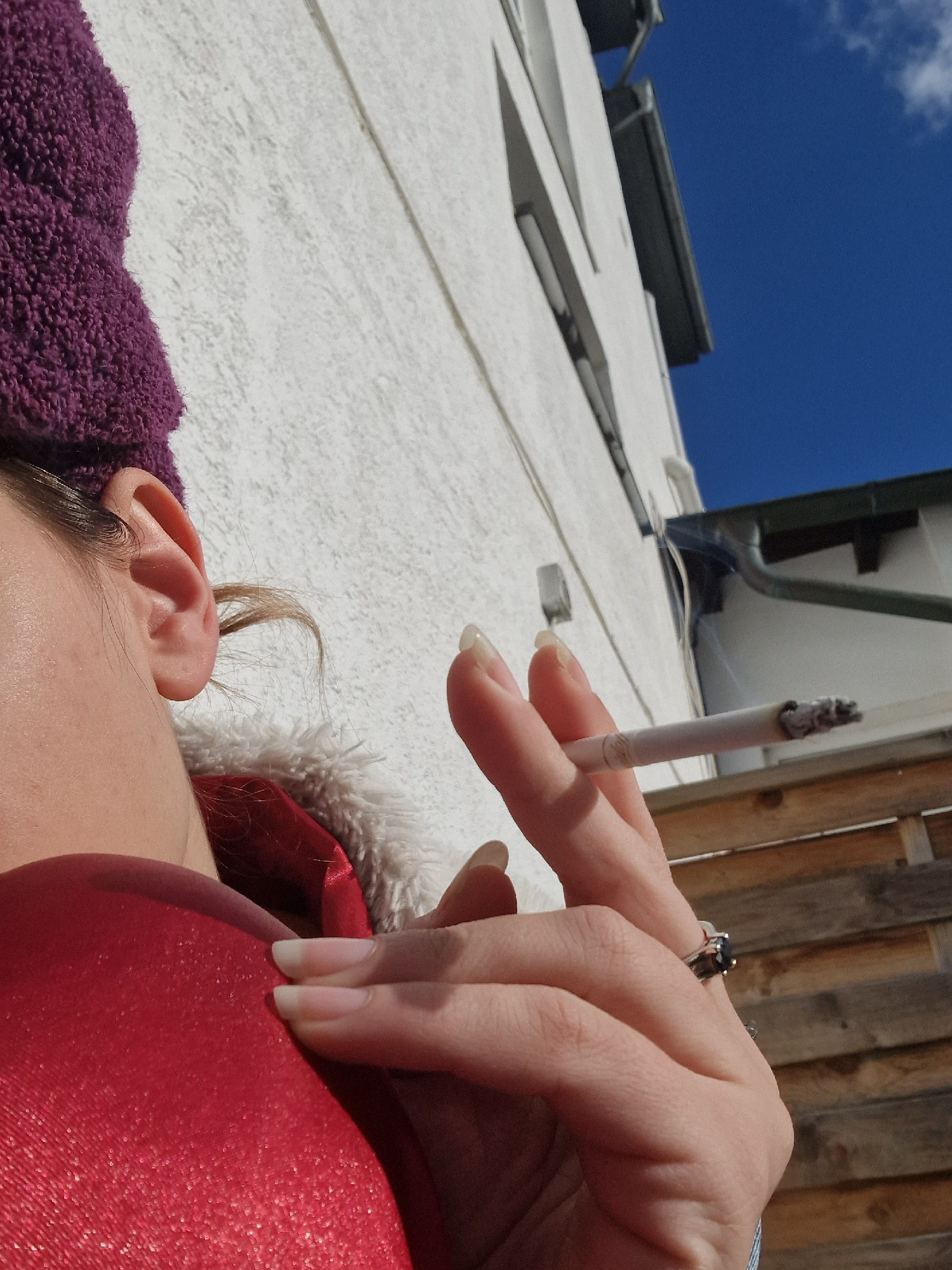 The image depicts a person holding a lit cigarette with a ring on their finger. The person is wearing a red jacket with a fur trim and a purple head covering. The background includes a wooden fence, a…read more