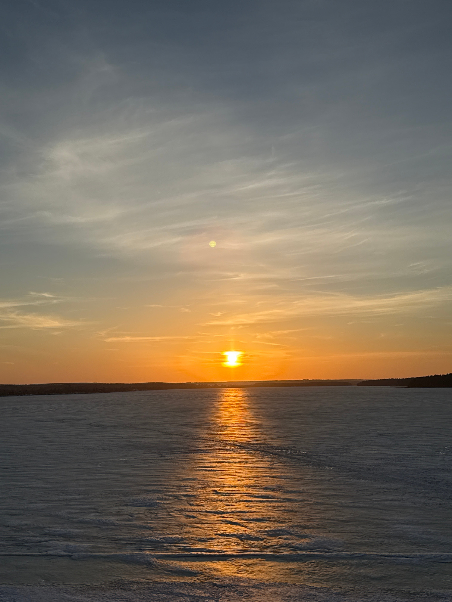 The image shows a sunset over a body of water, possibly a lake or a river. The sun is low on the horizon, casting a bright orange glow across the sky and reflecting on the water's surface. There are c…read more