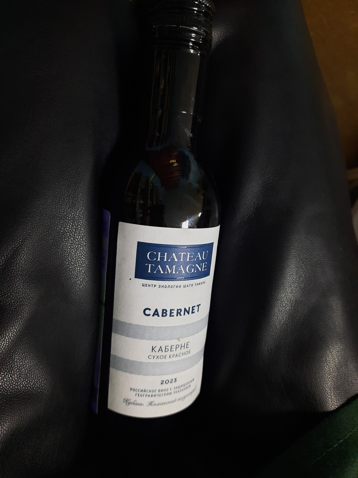 A bottle of Chateau Tamagne Cabernet red wine, vintage 2023, lies on a dark surface that appears to be leather. The label is white with blue text and vertical stripes. The text on the label is predomiβ¦read more