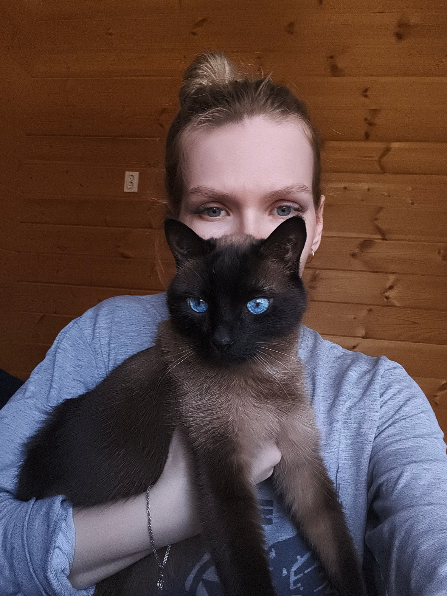 A person with blonde hair pulled back in a bun, blue eyes, and wearing a grey long-sleeved shirt is holding a Siamese cat with striking blue eyes. The background is a wood-paneled wall with an electri…read more