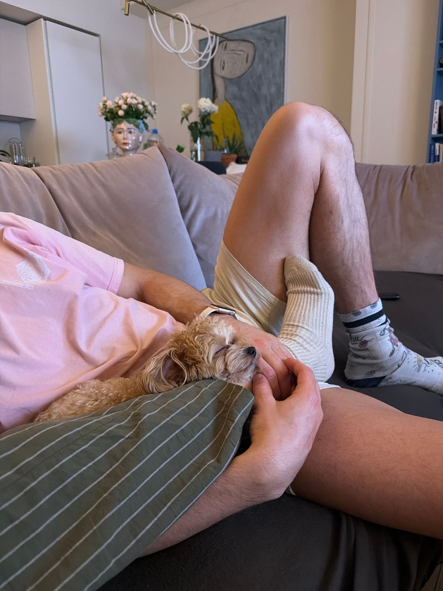 The image captures an intimate indoor scene in Moscow, Russia, depicting a person relaxing on a sofa with a small, fluffy dog. The person lies with their legs elevated and crossed; one foot wears a li…read more