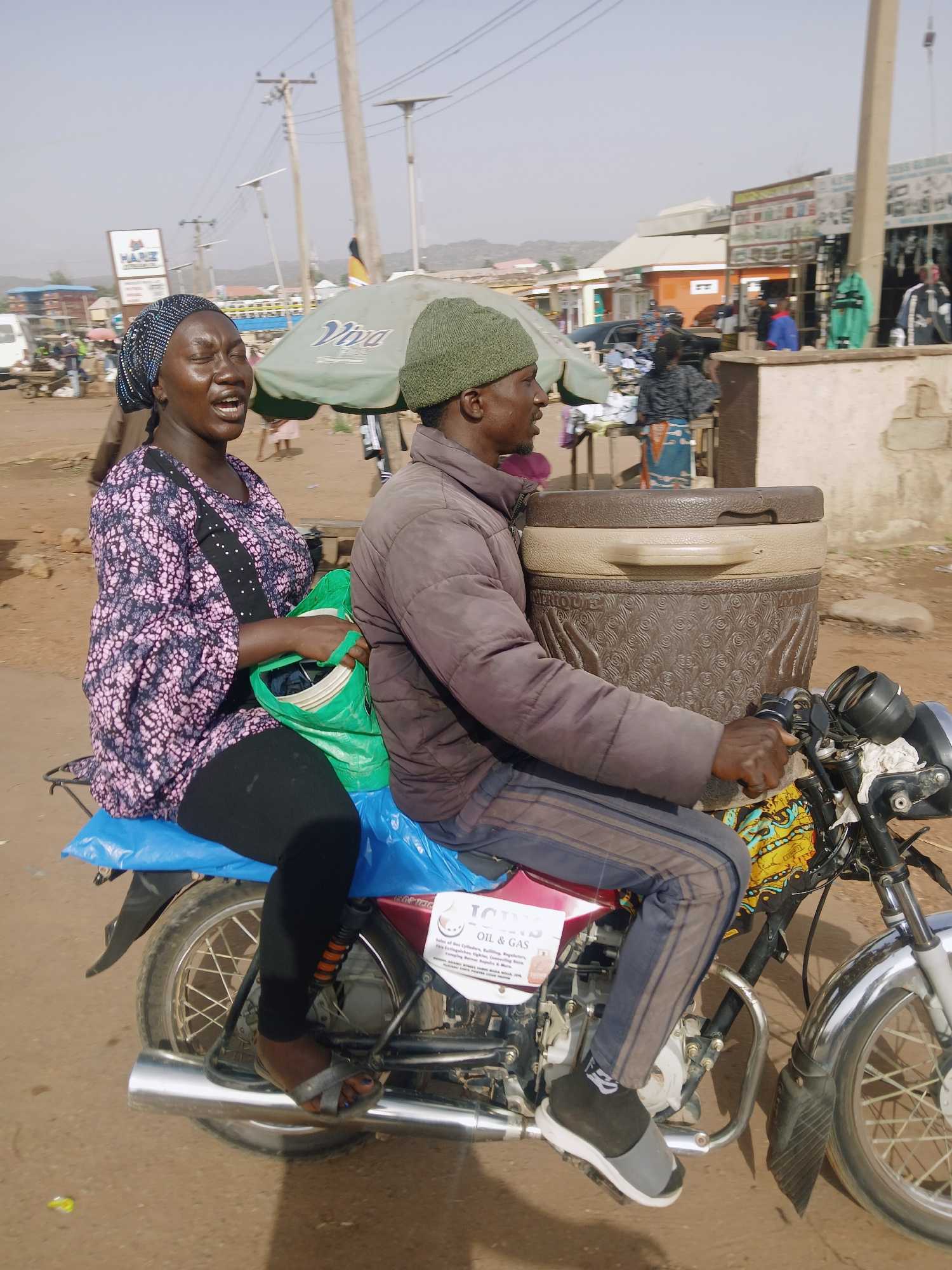 The image captures a lively street scene in Rafin Par, Nigeria, under bright, clear daylight. Two individuals, a man and a woman, are depicted on a motorcycle, which appears to be used for transportat…read more