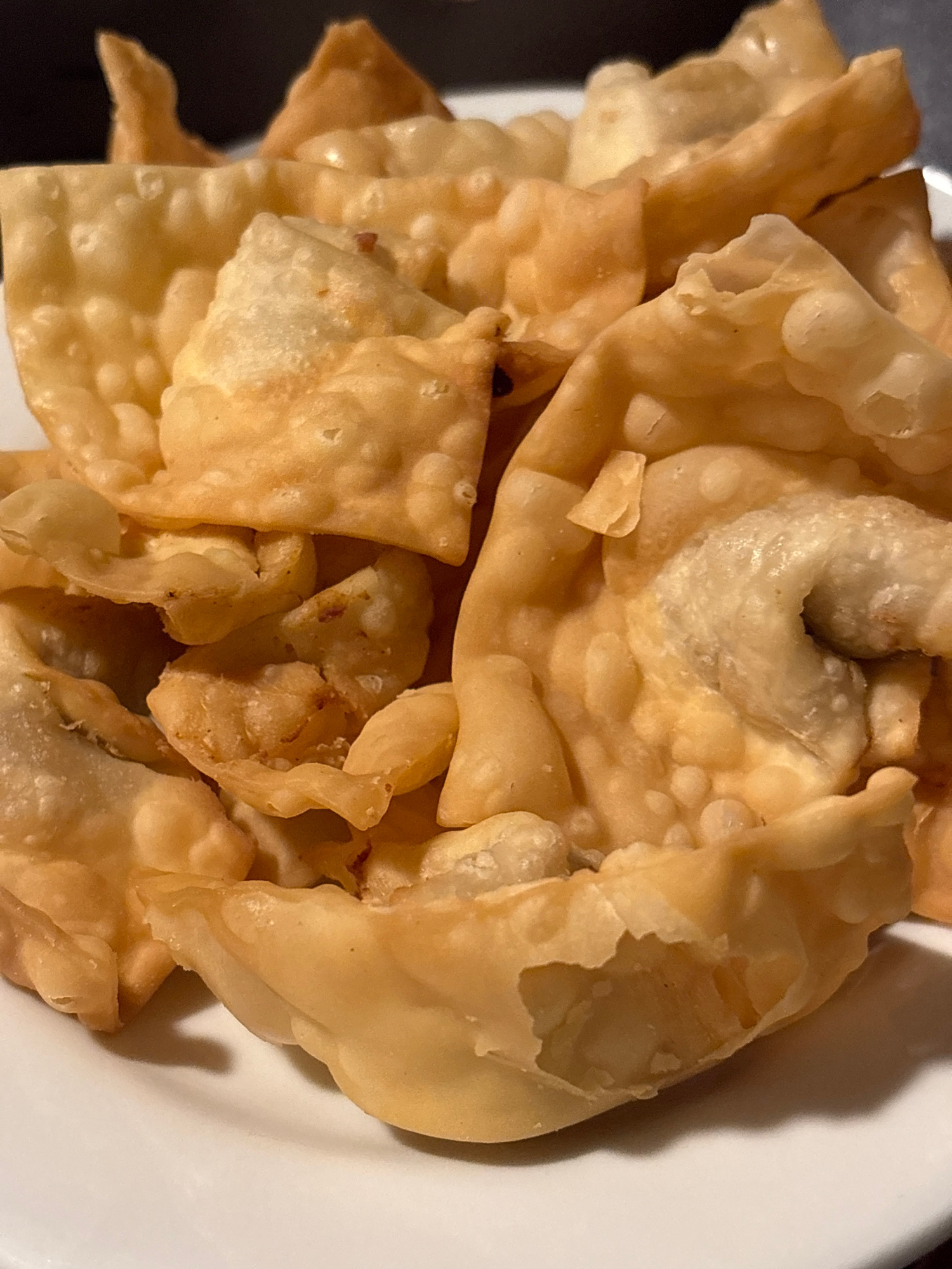 A close-up shot shows a pile of fried wonton wrappers in a white bowl. The wontons are golden brown and have a slightly bubbly texture. The location and city of Chorrillos, Peru are not discernable fr…read more