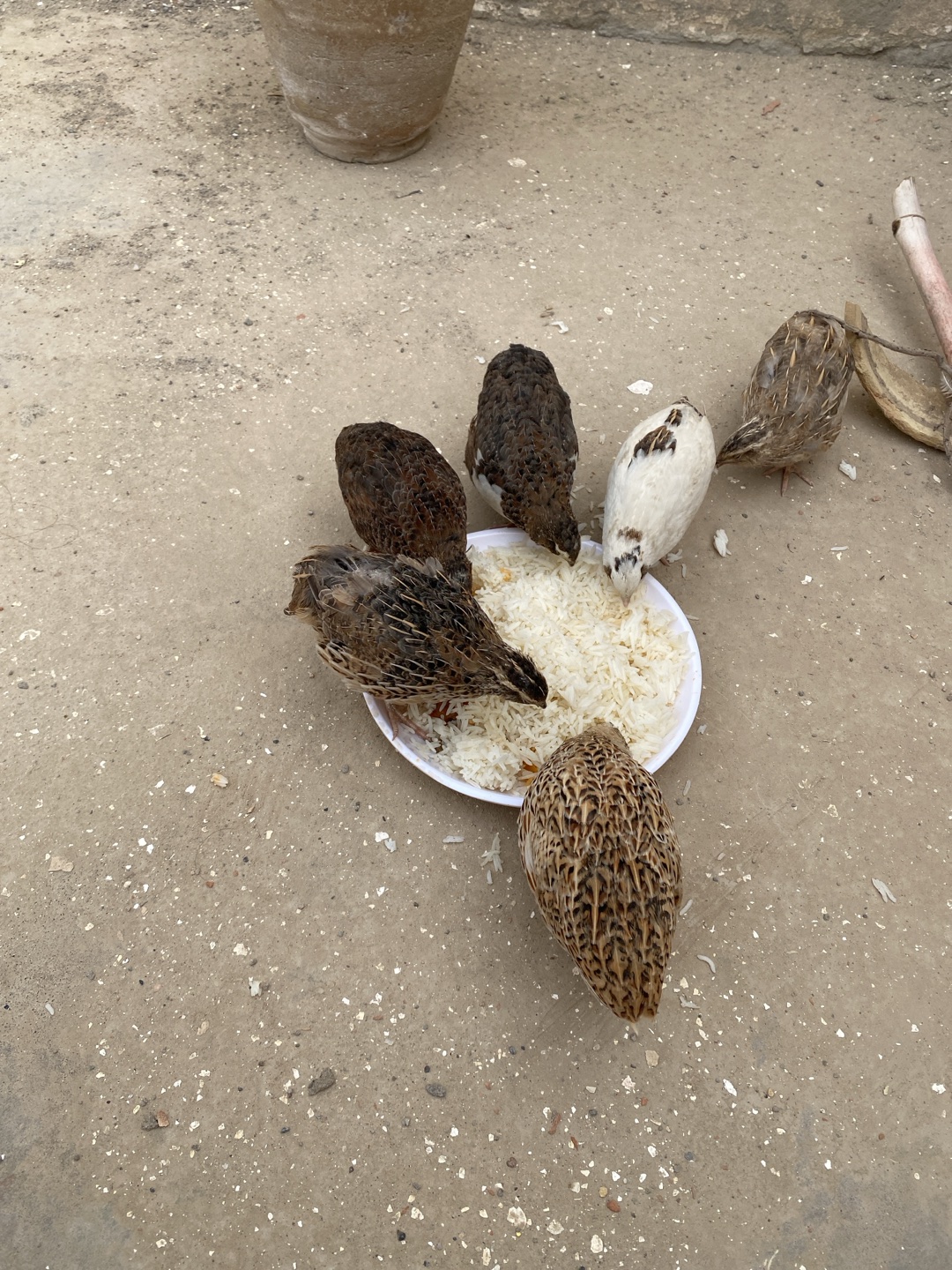 The image shows six quails eating rice from a white plastic plate on a beige concrete surface. One quail is white with brown spots, while the others are brown in various shades and patterns. A large c…read more