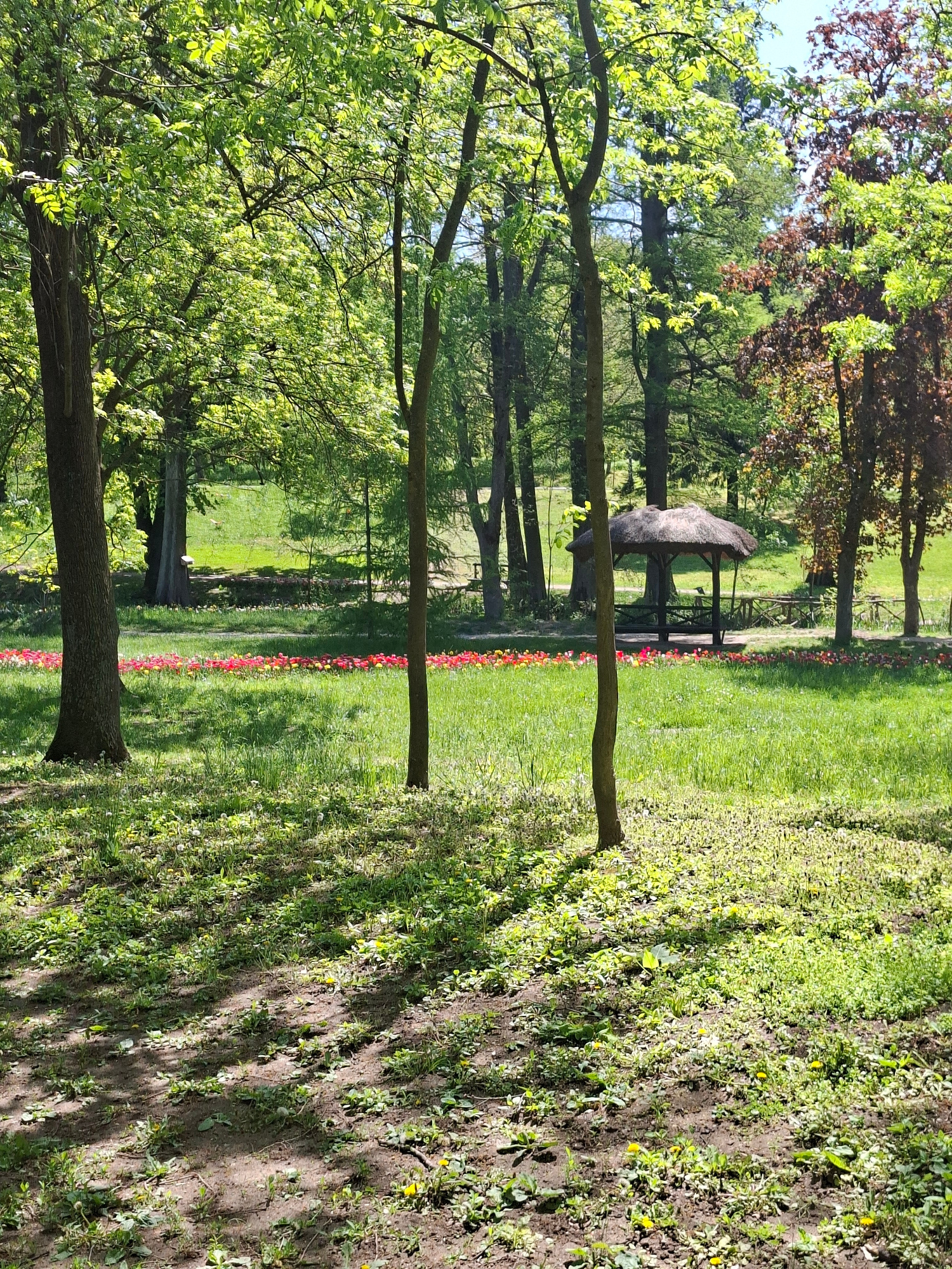 The image depicts a park setting in Craiova, Romania, characterized by lush greenery. A row of colorful flowers, primarily red and yellow, stretches across the midground. Trees line the path, their br…read more