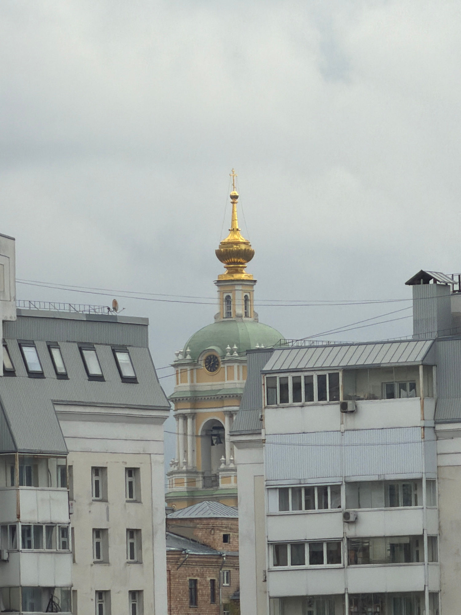 The image displays an urban landscape in Moscow, Russia, captured under an overcast sky. The photograph is oriented vertically, showcasing a juxtaposition of historical religious architecture and cont…read more