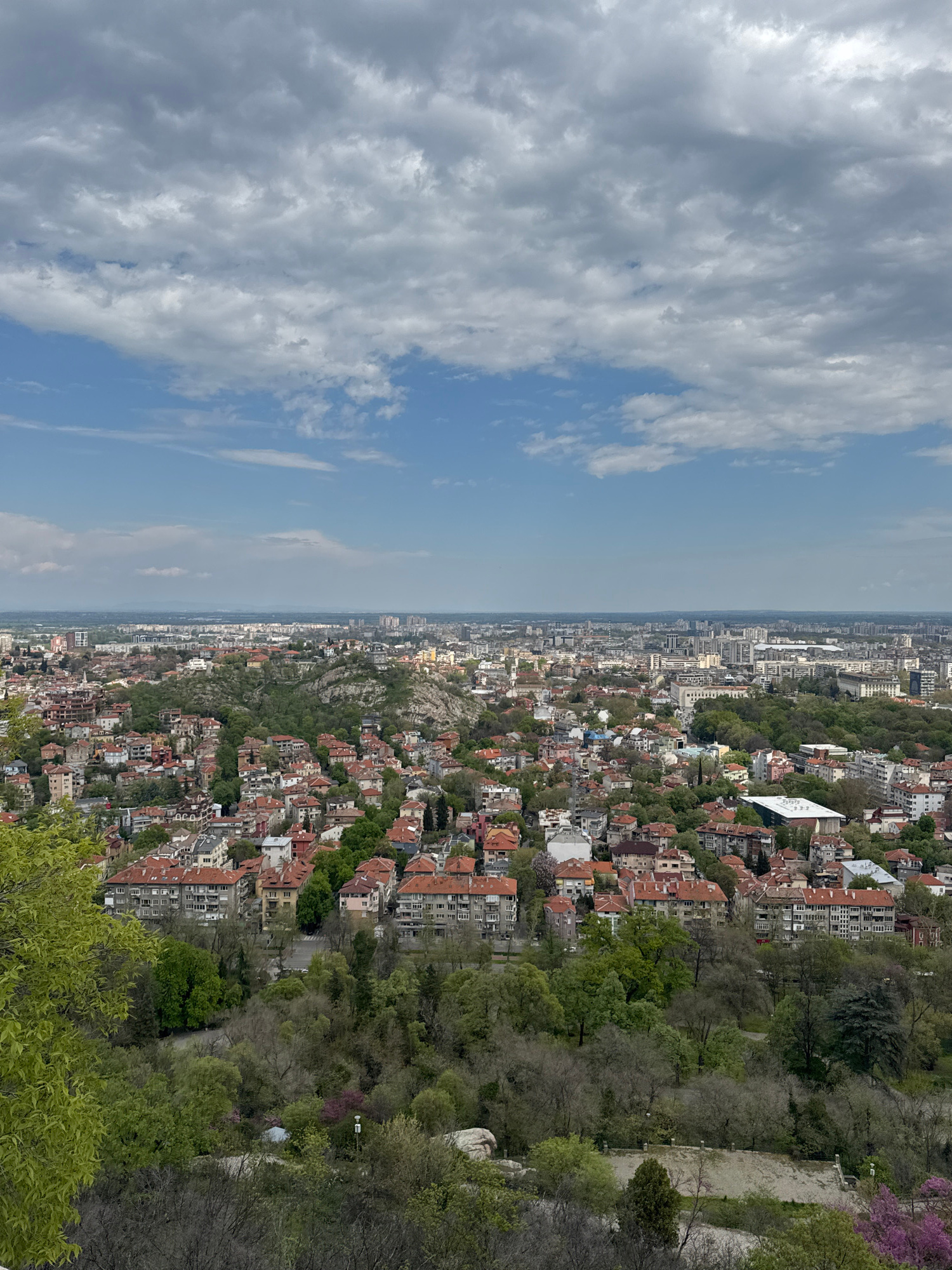 This wide-angle photograph presents a panoramic view of the city of Plovdiv, Bulgaria, captured from a high vantage point, likely one of its iconic hills. The image is horizontally divided, with the u…read more