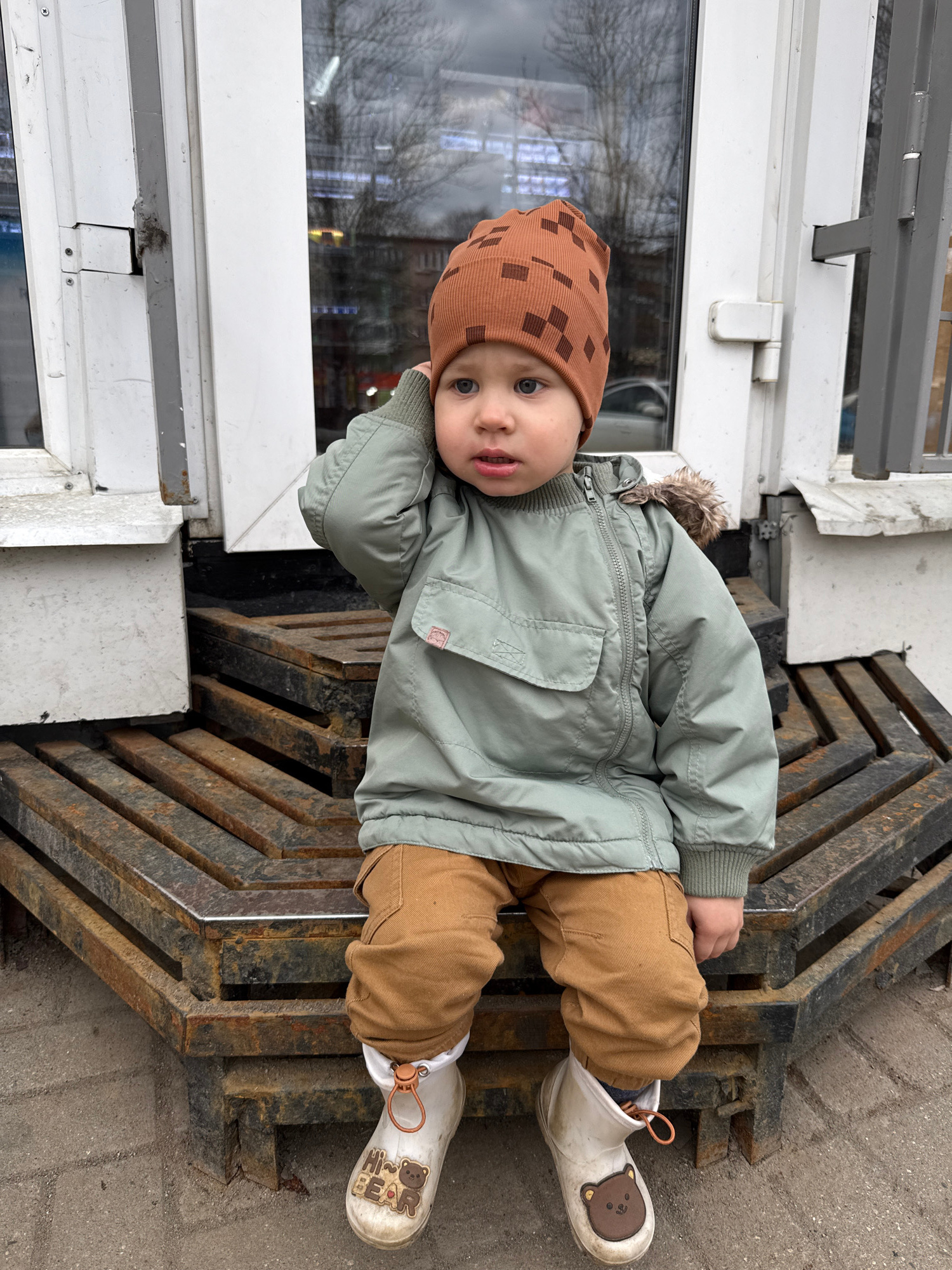 A young child is reclining on a dark metal grate next to a white window frame and light grey wall. The child is wearing a brown knit hat with a grid pattern, a light green jacket with a fur-trimmed hood, brown pants, and white boots with a brown bear decal. The location is presumed to be Rusanovo, Russia. | Open Wire