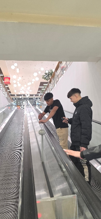 The image depicts an interior scene at Mall Galleria in Stara Zagora, Bulgaria, characterized by a prominent McDonald's logo and distinctive spherical ceiling light fixtures. Three individuals are pos…read more