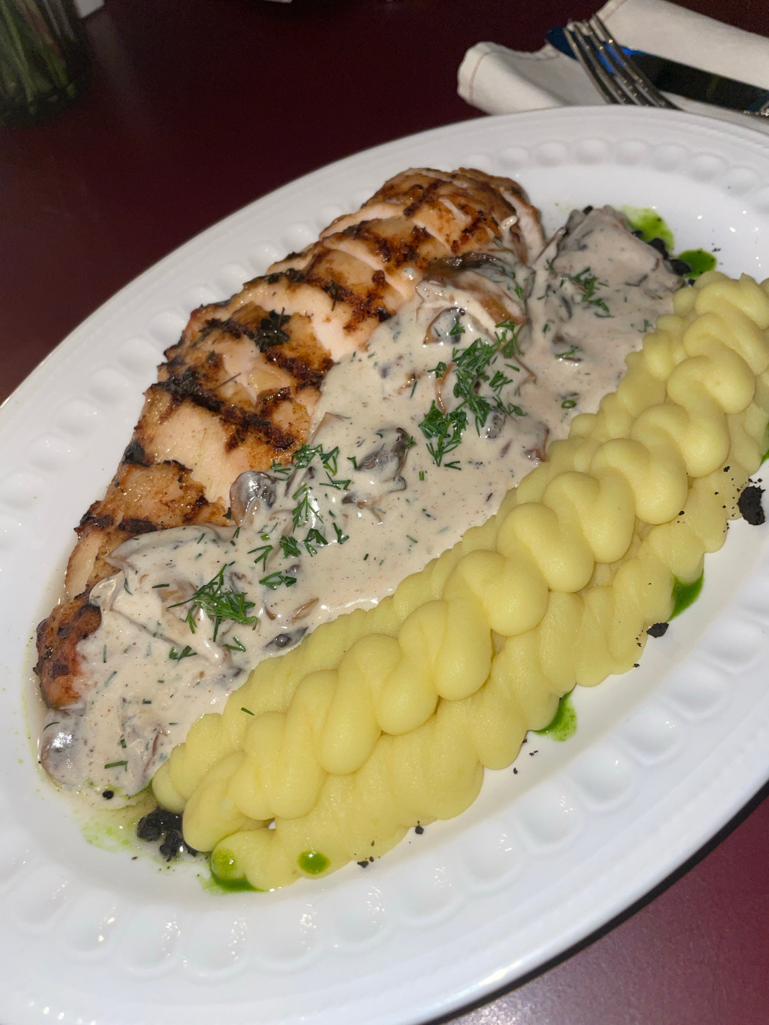 The image presents a plated dish featuring grilled chicken breast, topped with a creamy mushroom sauce, and accompanied by mashed potatoes, likely served in a restaurant setting. The chicken displays…read more
