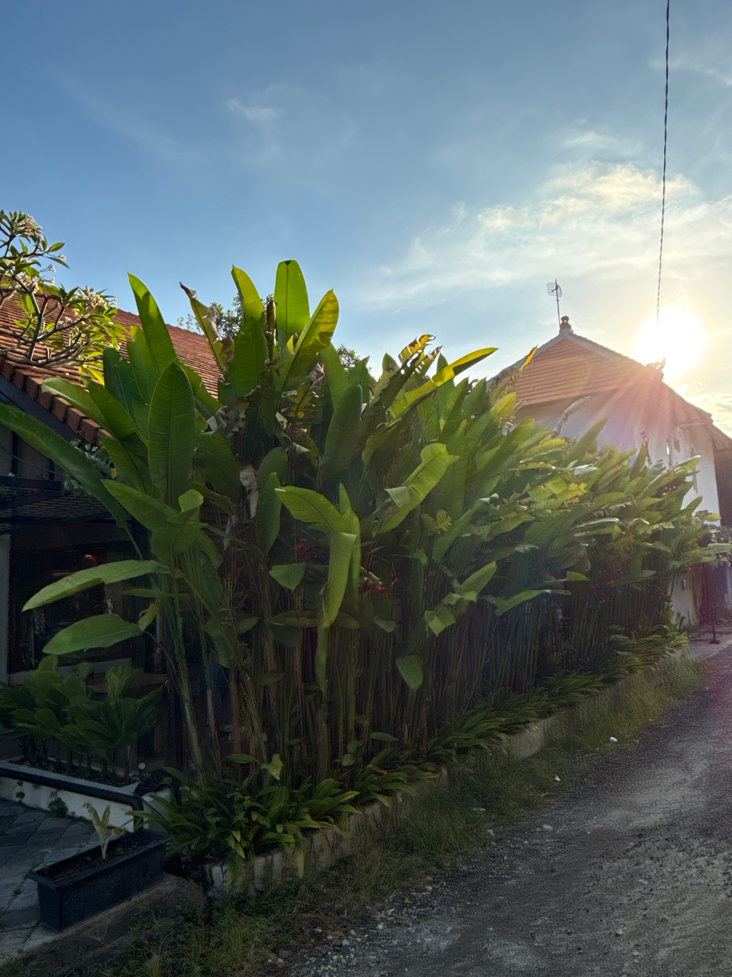 The image, taken in North Kuta, Indonesia, shows a street scene under bright sunlight. A building with a brown-tiled roof is visible. Lush green vegetation grows along the edge of the street, with tal…read more