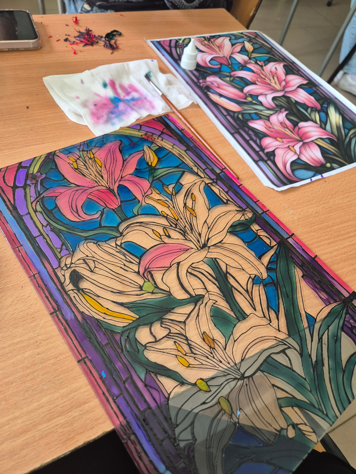 The image displays an indoor art workspace in Pavlikeni, Bulgaria, featuring a vibrant stained-glass-style artwork in progress. The scene is set on a light wooden table, where artistic creation is cle…read more