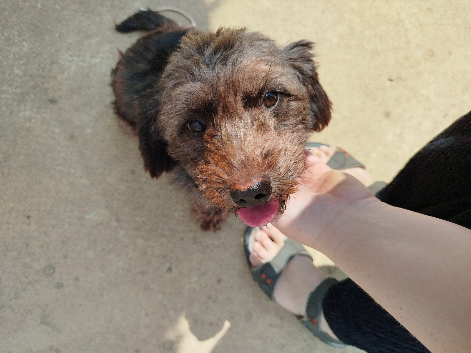 A brown and black terrier-mix dog looks up at the camera with its tongue out. A person’s hand is reaching toward the dog, and the person's feet, clad in gray and orange sandals, are visible. The scene…read more