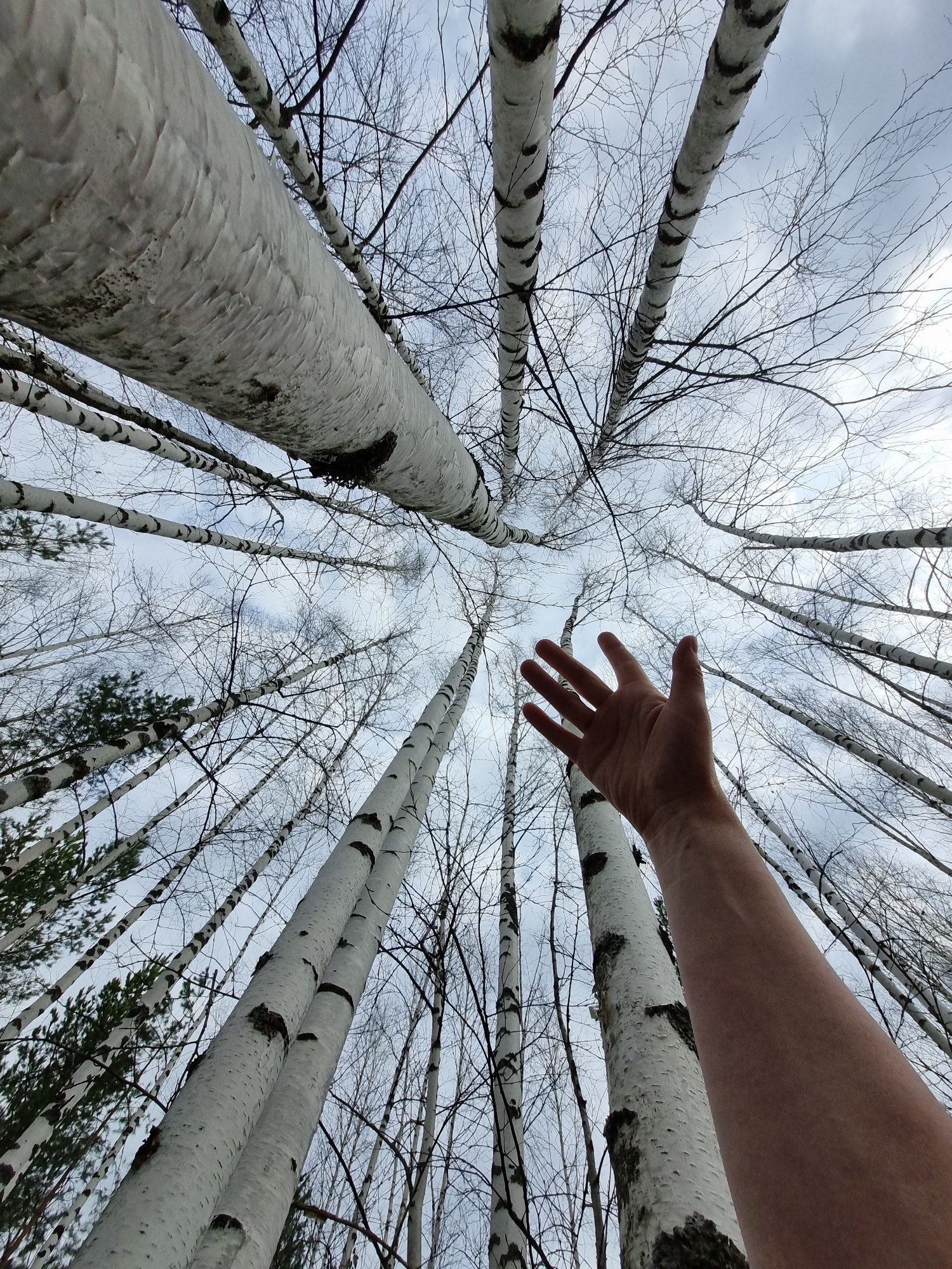 The image is a low-angle shot of a birch forest. The white bark of the birch trees is visible with dark markings. Most of the trees are bare, with only thin branches. A human arm and hand are in the f…read more