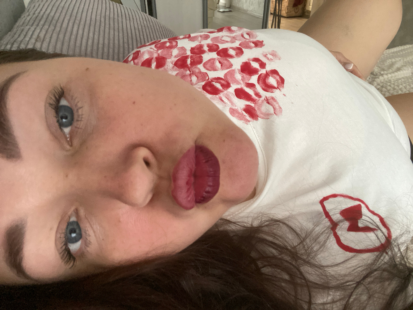 A woman lies on her side, resting her head on a striped pillow. She has fair skin, blue eyes, and dark eyebrows and hair. Her lips are painted a deep red. She wears a white T-shirt adorned with red li…read more