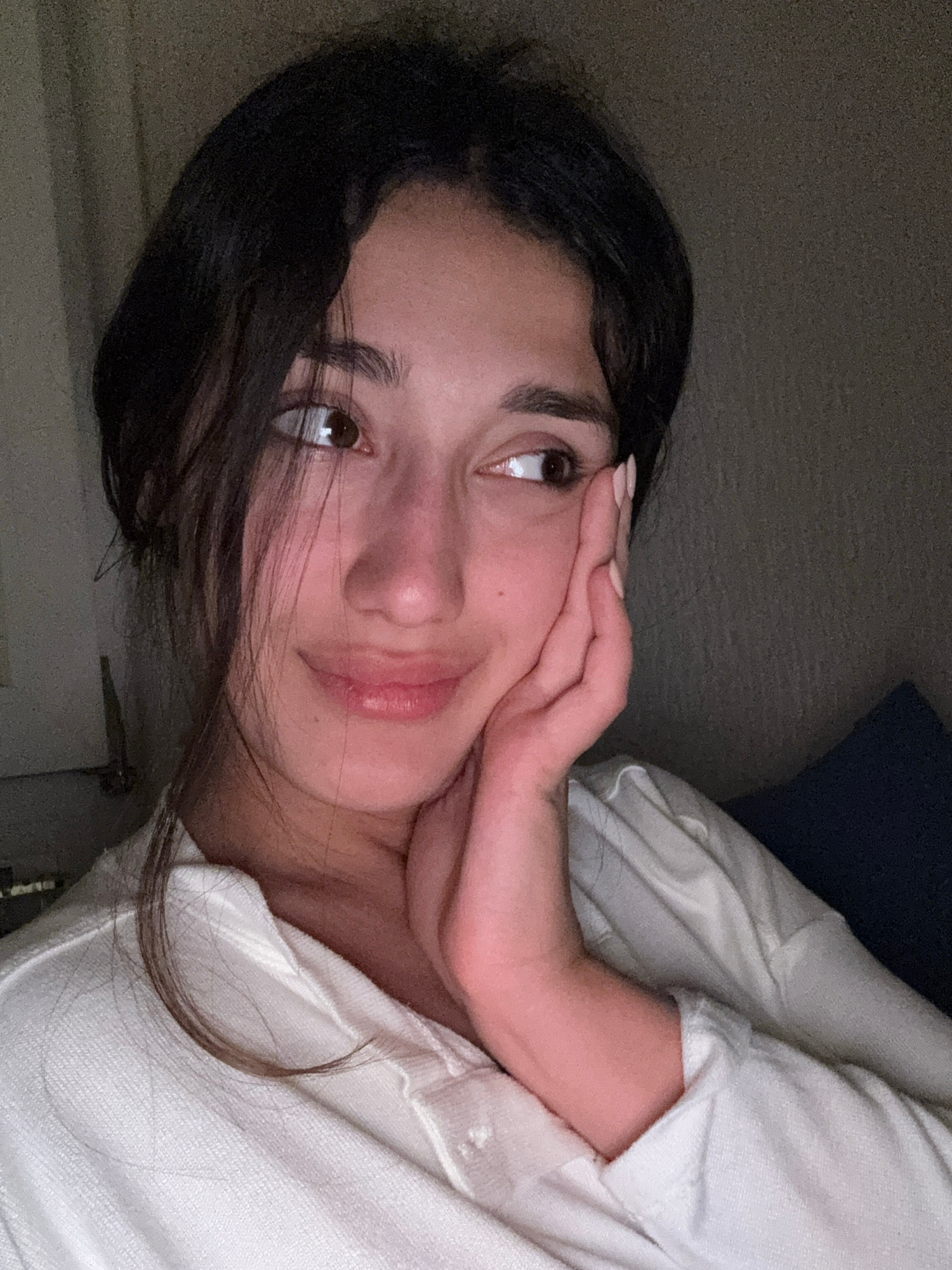 A young woman with dark hair and brown eyes is seen in a close-up indoor portrait. She is wearing a white button-down shirt and resting her hand on her cheek. The lighting is dim, and the background i…read more