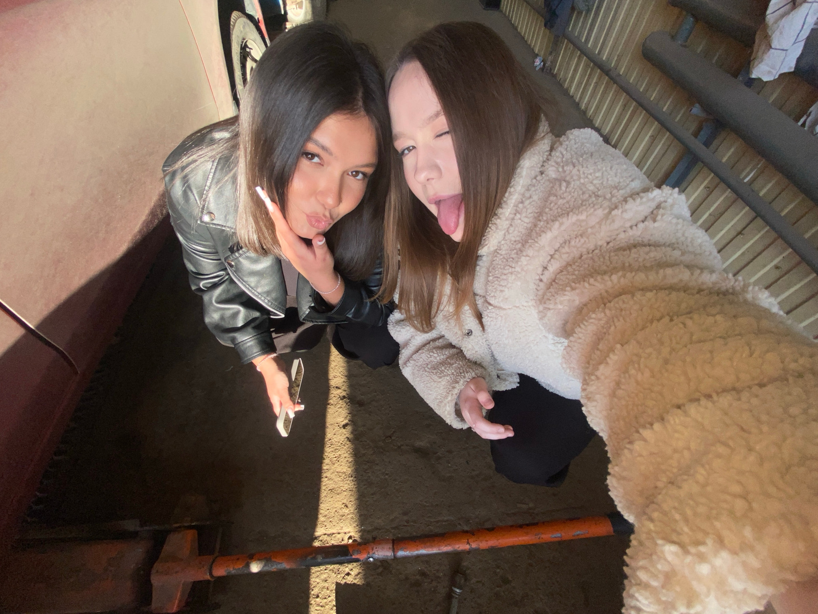 Two young women pose for a selfie outdoors. The woman on the left has short dark hair and wears a black leather jacket. She is making a kissing face and holding a smartphone in her other hand. The wom…read more