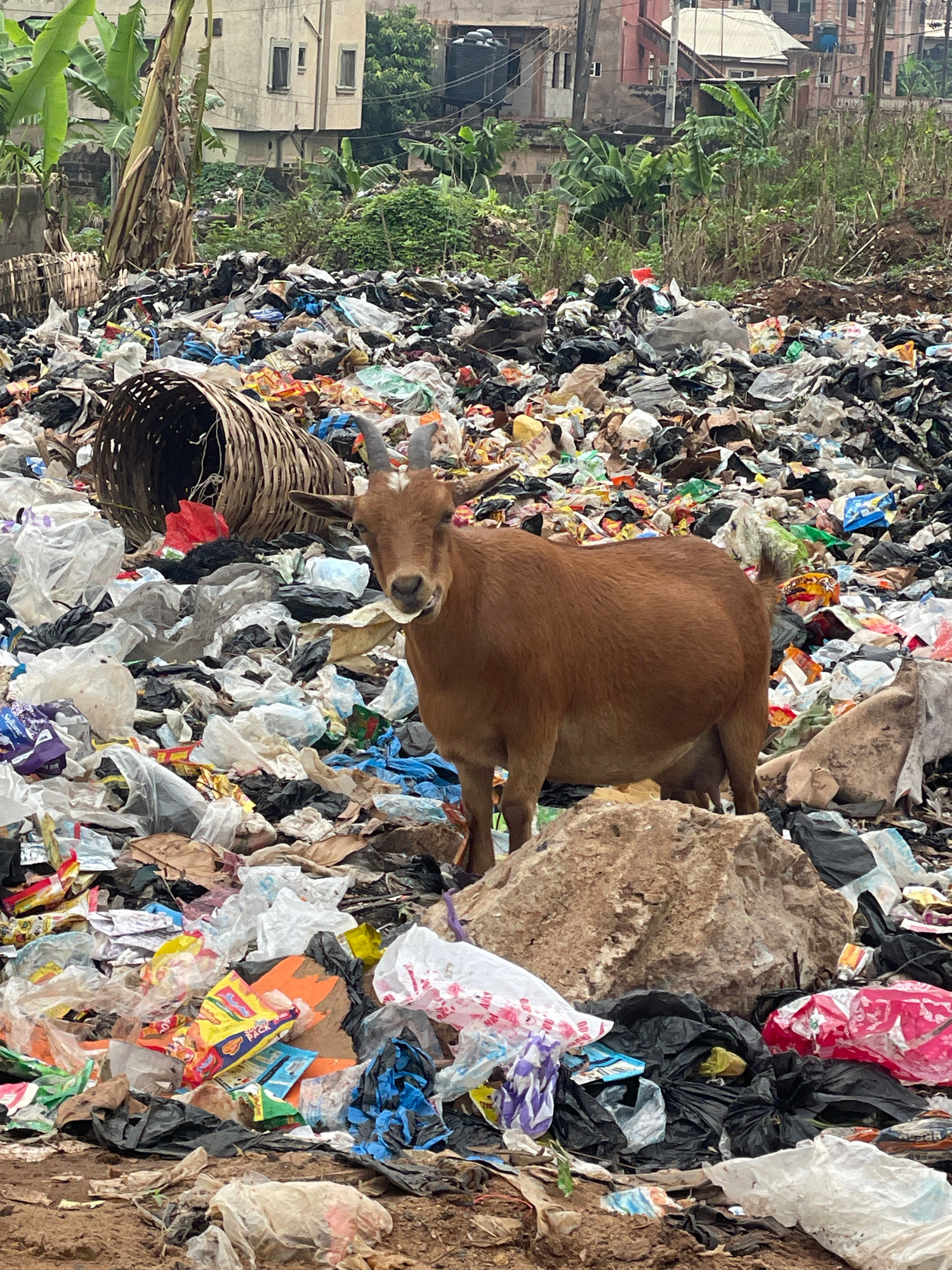 A brown goat stands on a large pile of garbage in Onitsha, Nigeria. The garbage includes plastic bags, paper, and food waste. A woven basket and large stones are visible within the trash pile. Buildinβ¦read more