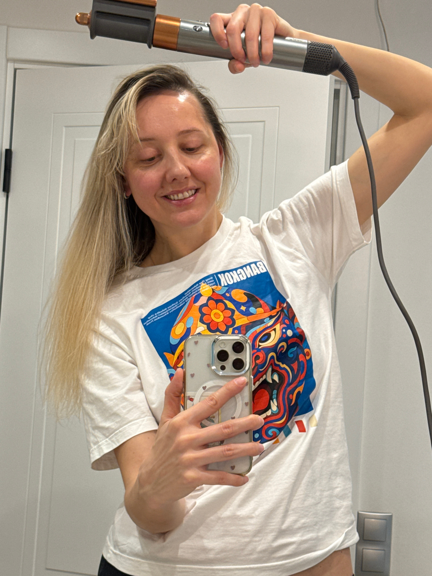 A woman is taking a selfie in front of a white paneled wall. She is holding a Dyson hair styler in her left hand and a smartphone in her right hand, using it to capture the image. The woman is fair-sk…read more