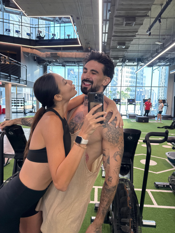 This image captures a mirror selfie of a female and a male in a modern high-rise gym facility in Bangkok, Thailand. The female, on the left, has dark hair in a ponytail and is dressed in a black sporβ¦read more