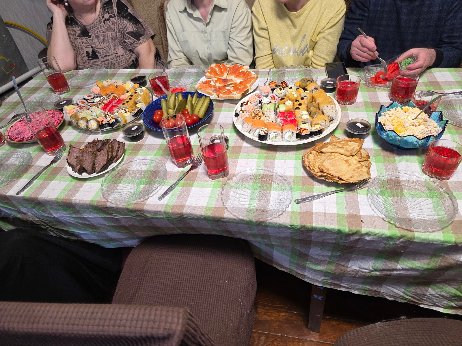 A group of at least four people is gathered around a table laden with a diverse meal, likely a family or social gathering in Chaikovsky, Russia. The table is covered with a green and white checkered t…read more