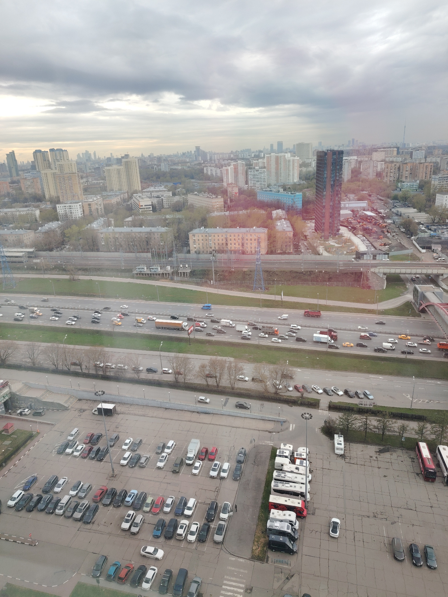 This media file presents a high-angle, expansive view of an urban landscape under an overcast sky. **Subjects:** The scene is dominated by a city with numerous multi-story buildings, including both o…read more