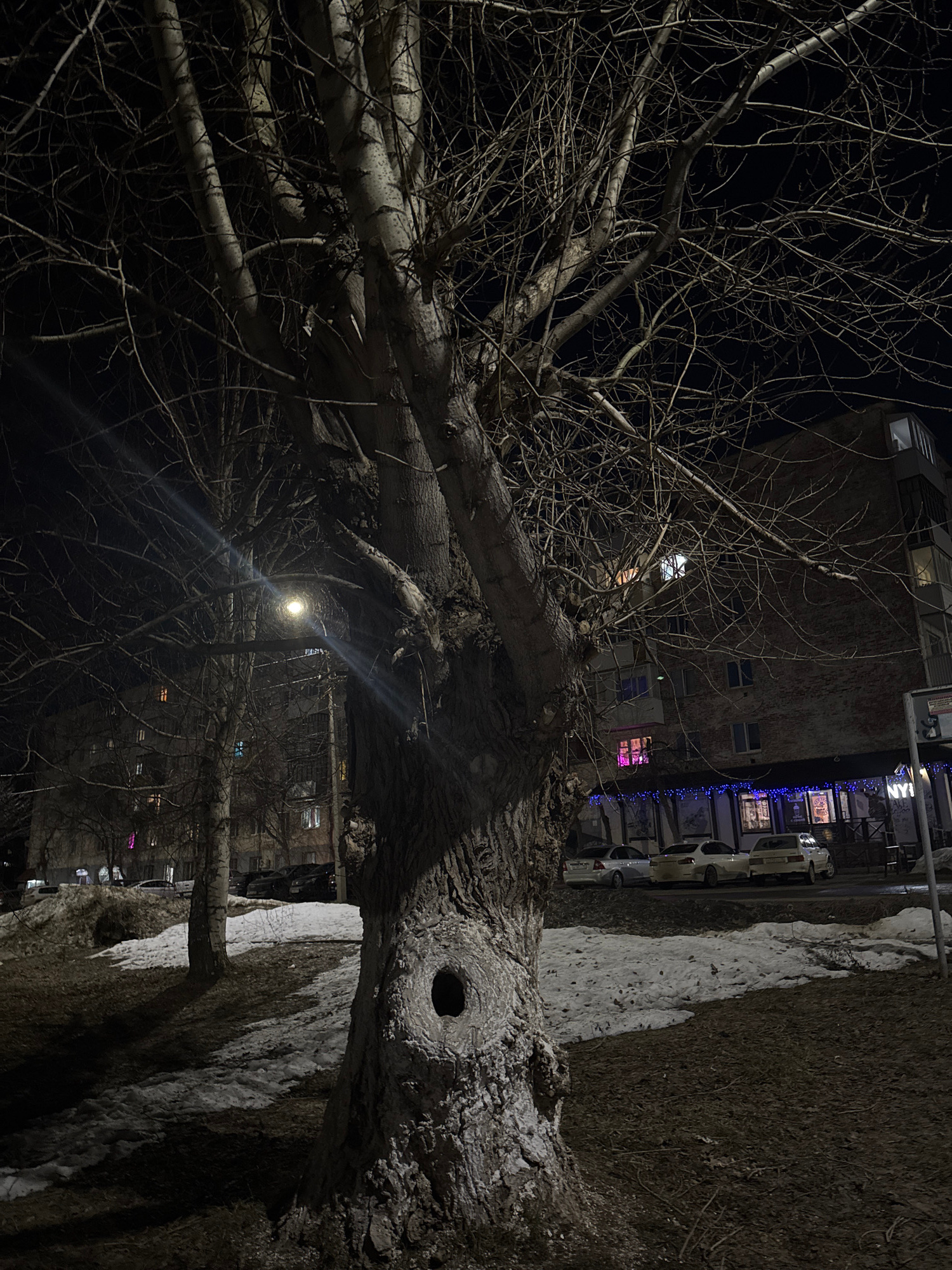 A nighttime outdoor scene shows a large tree in the foreground, appearing to be in a park or green space in Votkinsk, Russia. The tree's branches are bare, suggesting winter or late autumn. The tree's…read more