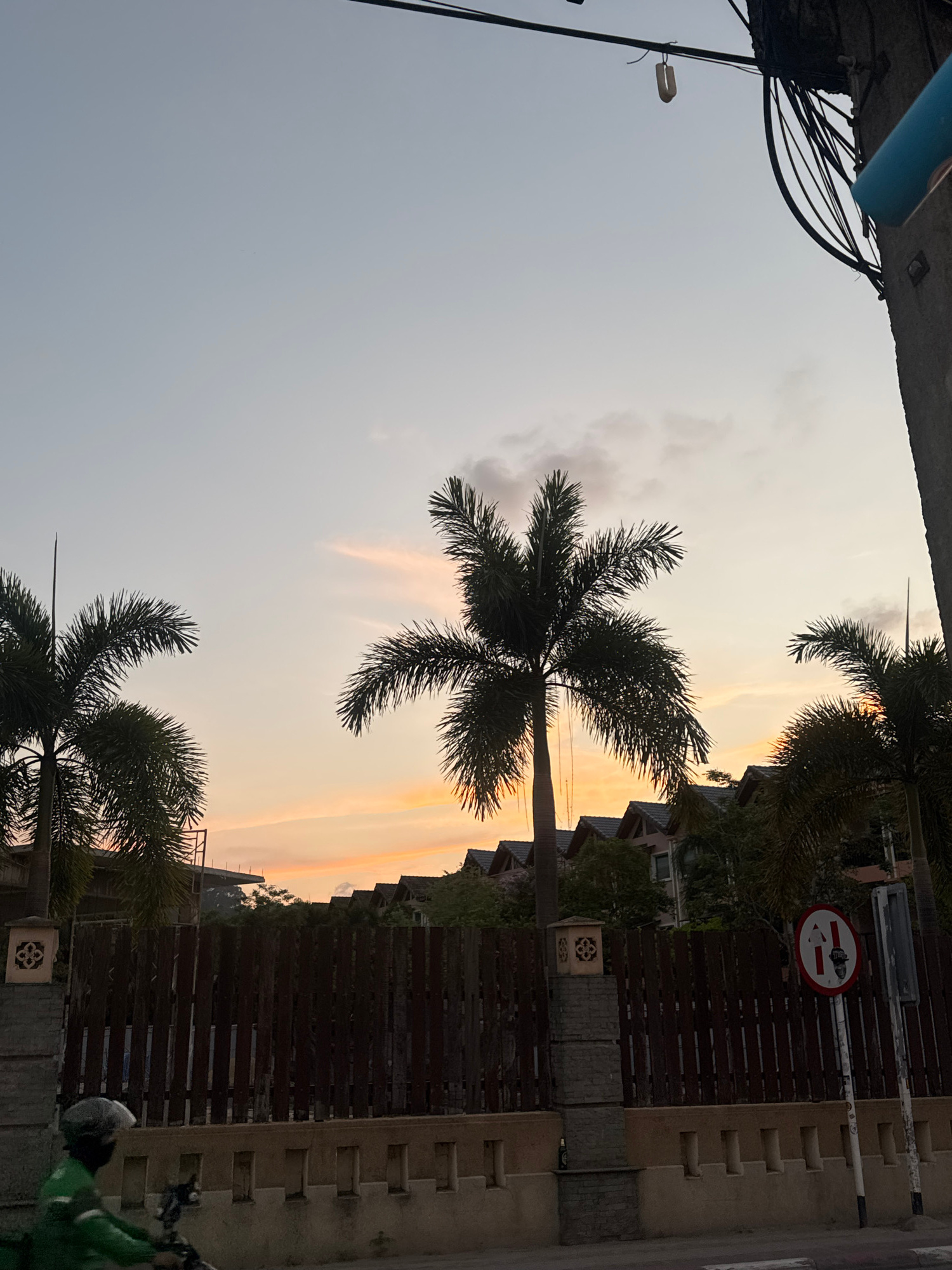 The image shows a street scene in Patong, Thailand, at dusk. Palm trees are visible against a sky with streaks of orange and gray. A no-entry traffic sign is mounted on a gate adjacent to a wall. Over…read more