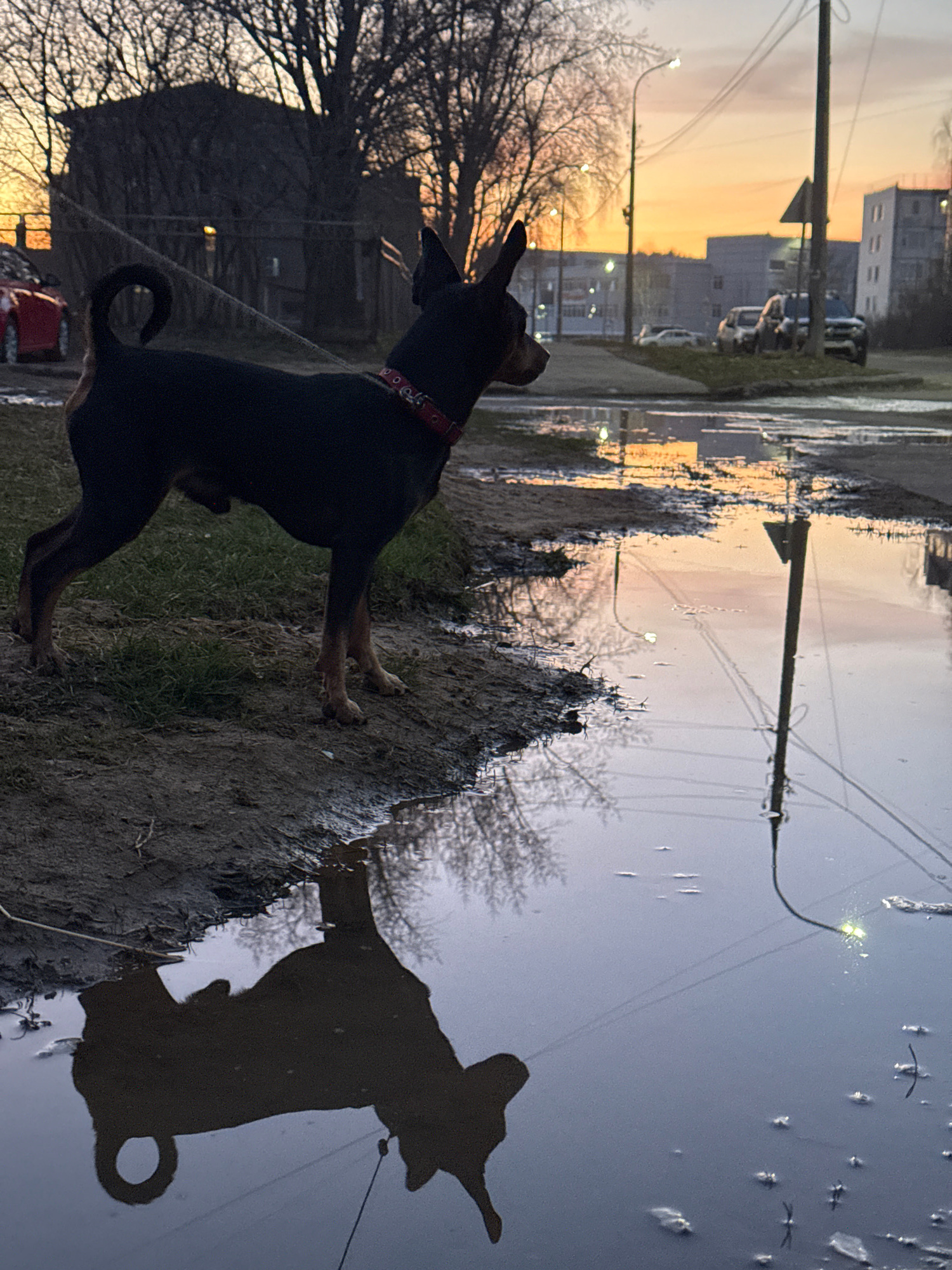 This image, captured in Chaikovsky, Russia, presents an outdoor scene at either sunrise or sunset, characterized by a soft, warm light. A dark-colored dog, wearing a red collar, is the main subject, s…read more