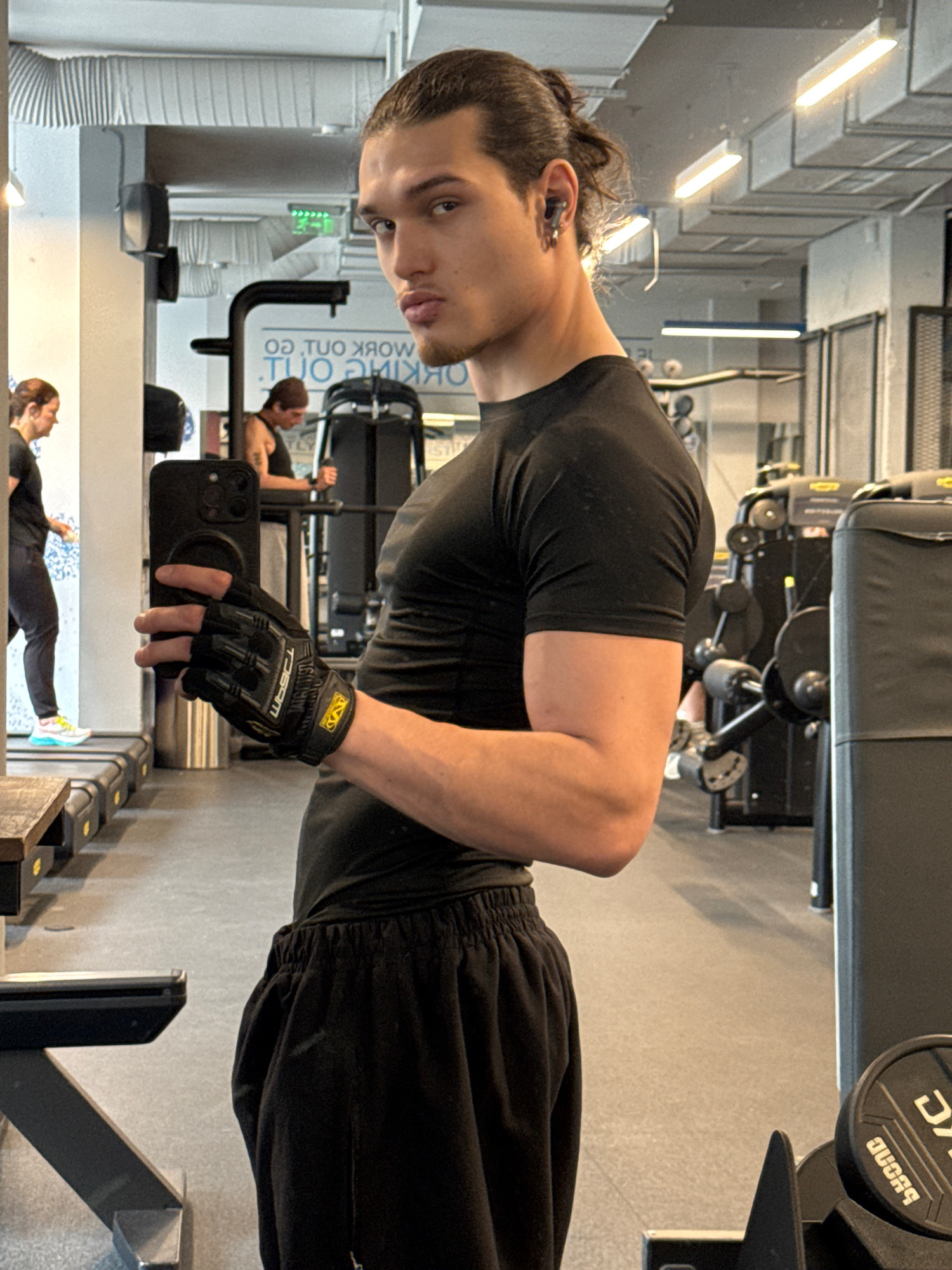 This image captures a young man taking a selfie in a gym, likely located in Sofia, Bulgaria. The man, with dark hair tied back, is wearing a black short-sleeved t-shirt and black workout pants. He has…read more