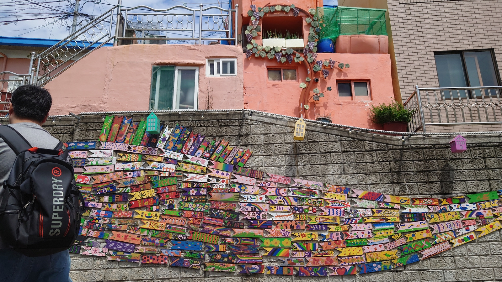 A medium-shot photograph depicts a man standing in front of an artfully decorated brick wall. The man, with short black hair, is seen from the back, wearing a gray shirt and a black backpack with "SUP…read more