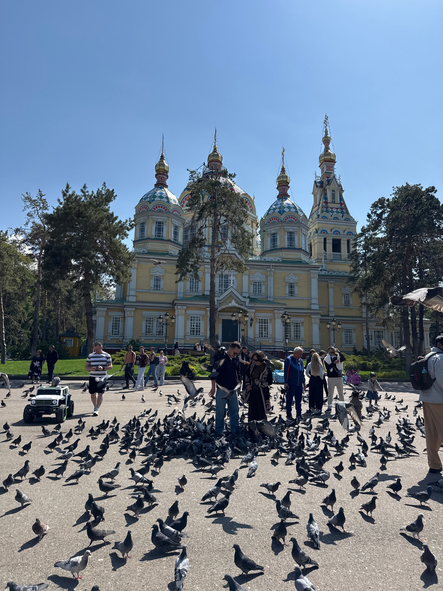 The image shows the Ascension Cathedral, a Russian Orthodox cathedral in Almaty, Kazakhstan. The cathedral has multiple domes and is surrounded by trees, people, and pigeons. The ground is paved and c…read more