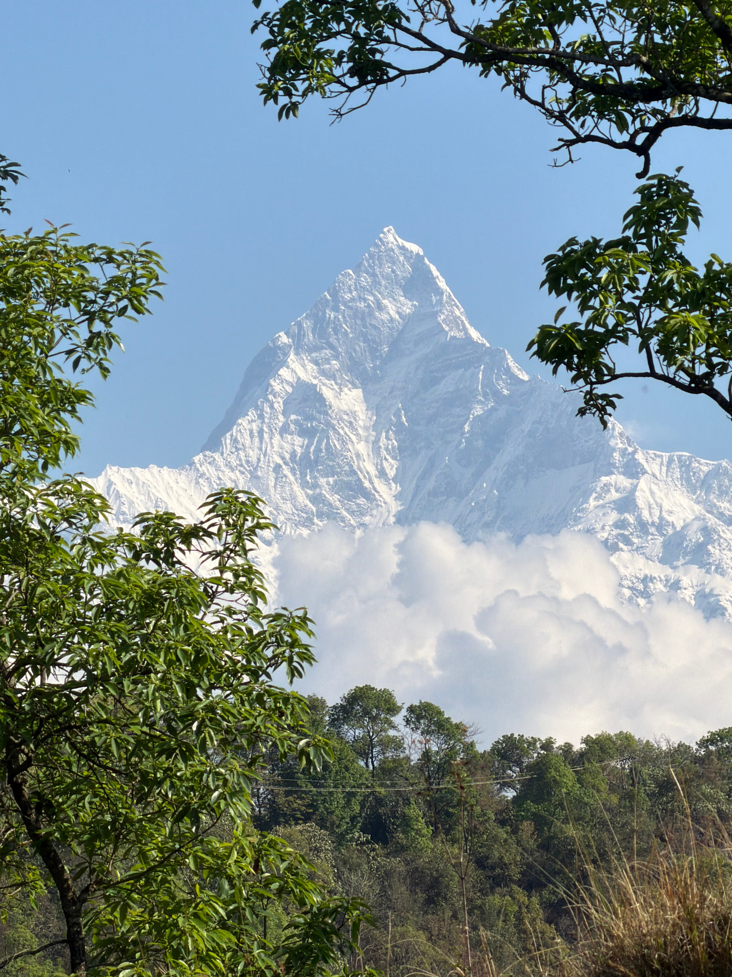 The image depicts a mountain scene framed by trees, likely taken in the vicinity of Pokhara, Nepal. The dominant feature is a large, snow-capped mountain peak that rises dramatically against a blue sk…read more