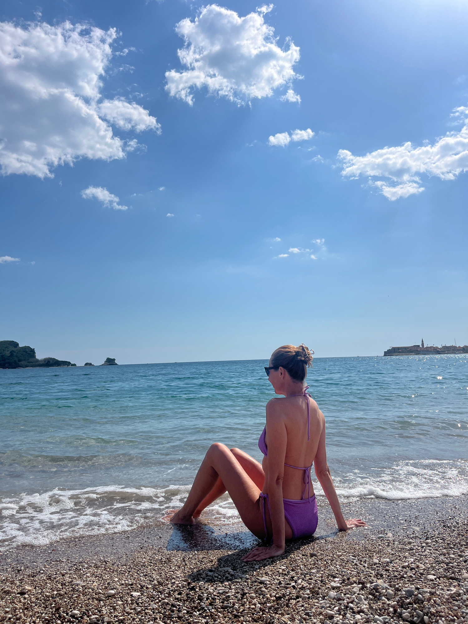 A woman in a purple bikini is kneeling on a pebble beach in Budva, Montenegro. The sea is to her left, and the sky is above. The sky is blue with white clouds. The waves are lapping at the shore. In t…read more