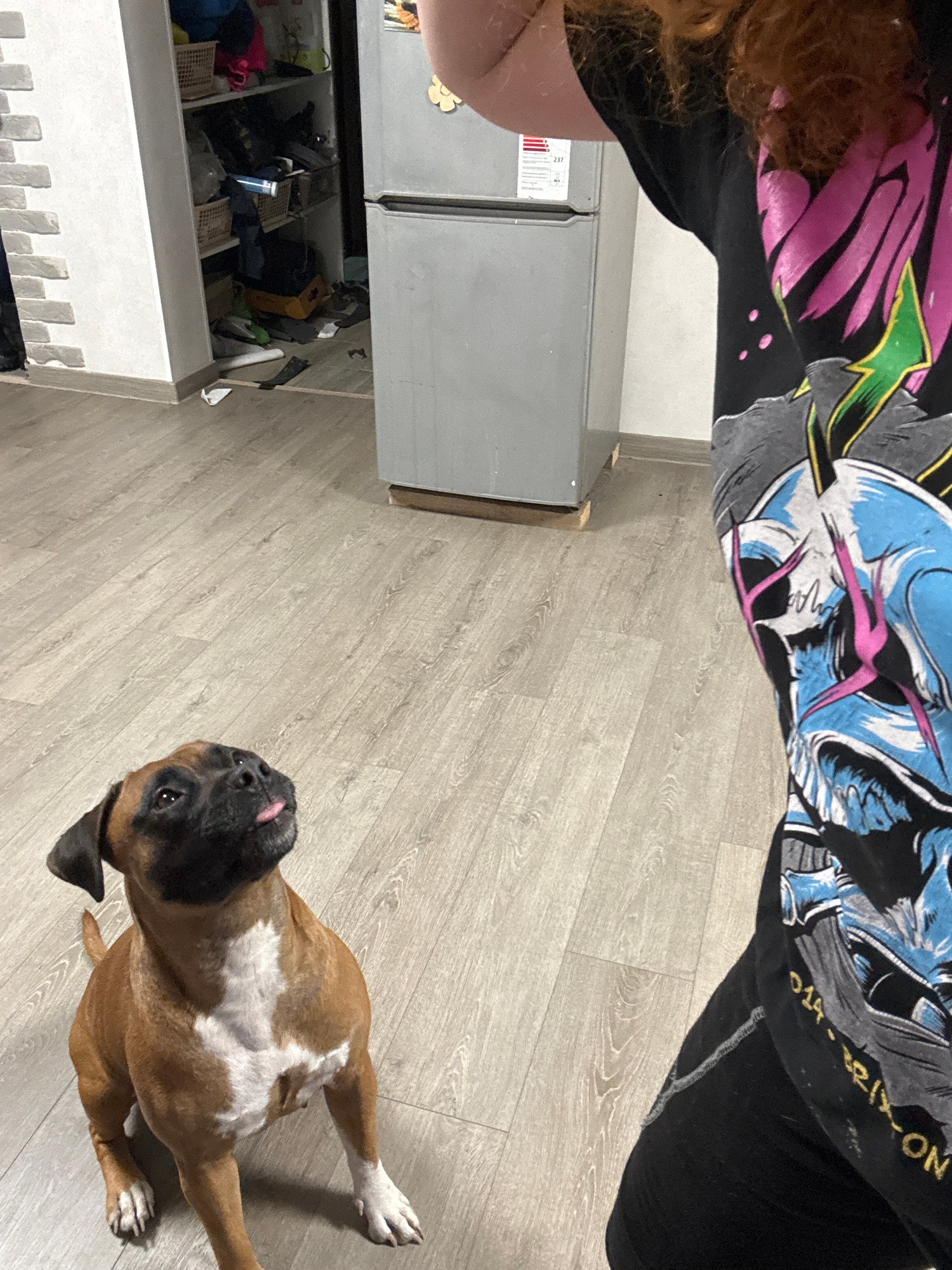 A first-person perspective shot shows a person standing near a partially open refrigerator with a light-colored wooden floor in a residential space. A brown and white Boxer dog lies on the floor, look…read more