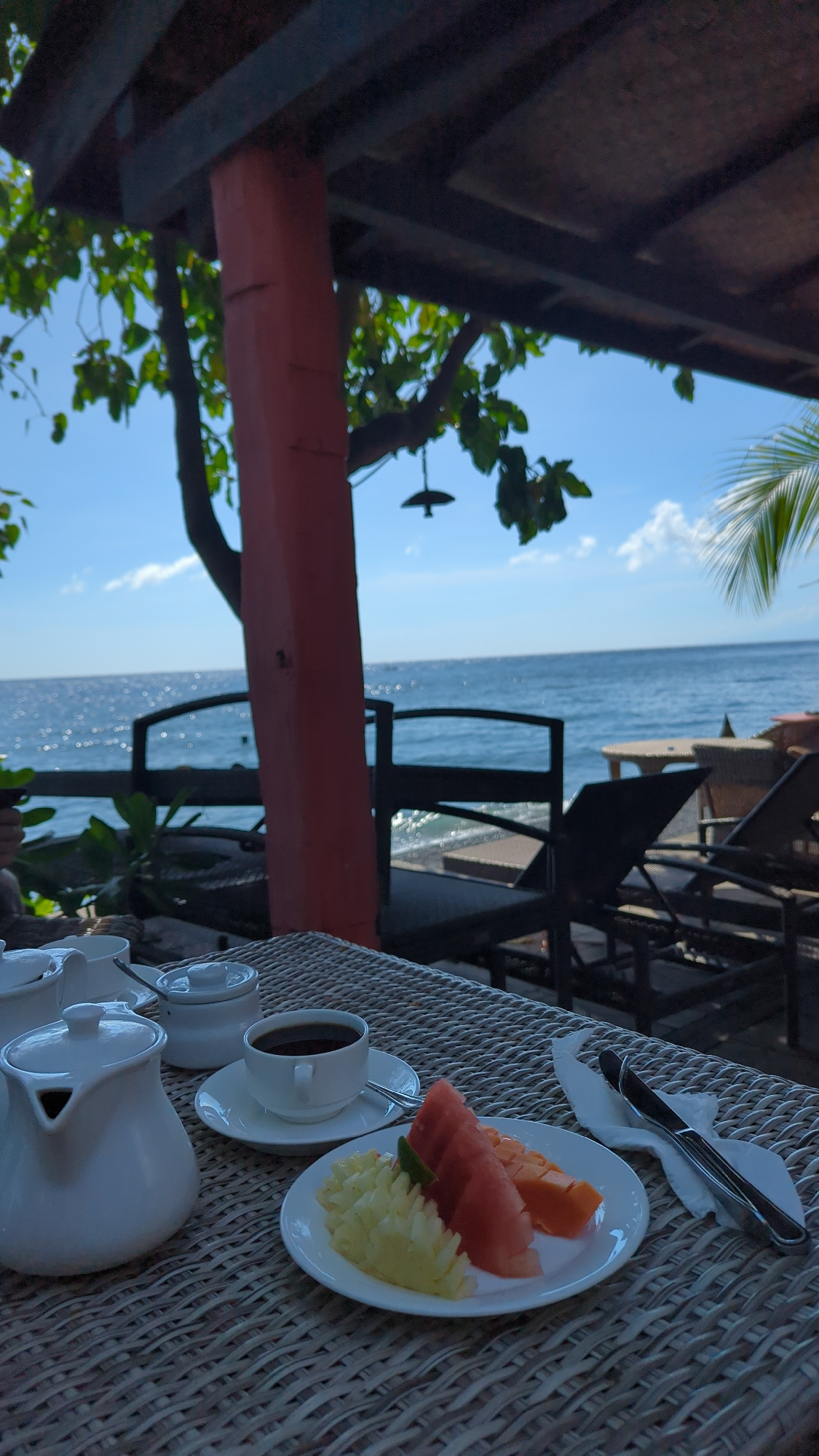 The image depicts a breakfast setting with a view of the sea in Abang, Indonesia. A white plate contains sliced watermelon, papaya, and pineapple. Utensils wrapped in a white napkin lay near the plate…read more