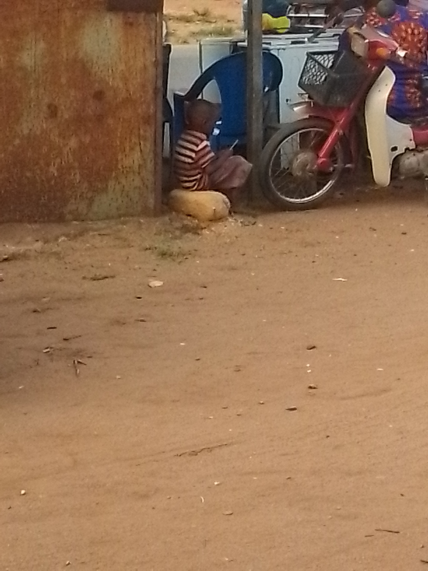 The image shows a person sitting on a beige object next to a rusty brown metal structure. The person is wearing a striped shirt. A red motorcycle is parked nearby, partially obscuring a blue plastic c…read more