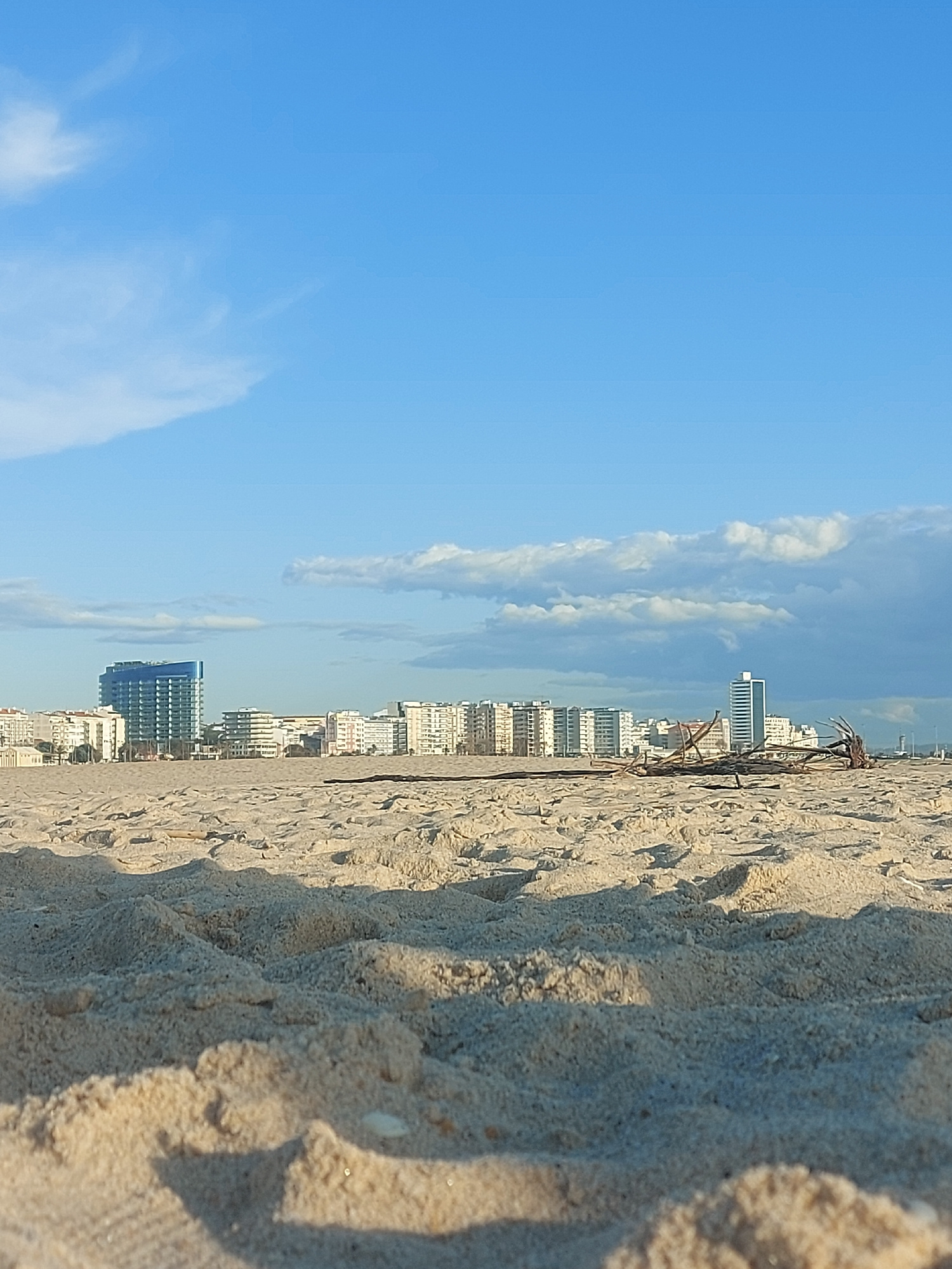 The scene depicts a beach in Figueira da Foz, Portugal. The view is taken from ground level, emphasizing the sand in the foreground. The sky is blue with scattered clouds. In the midground, a line of…read more