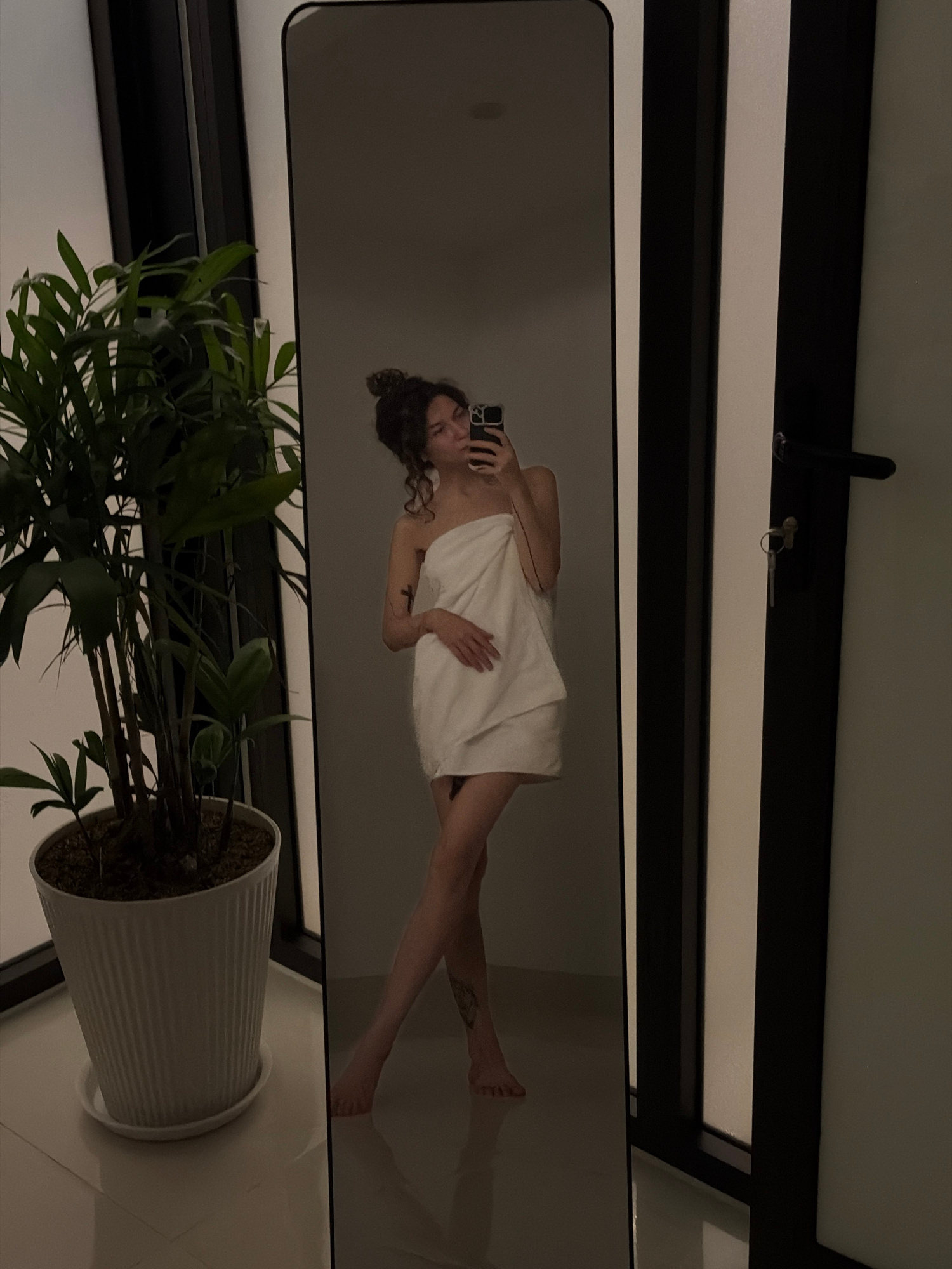 A mirror reflects a woman wrapped in a white towel, holding a phone, presumably taking a photo of herself. She has dark hair and fair skin, and appears to be in an indoor setting. In front of the mirr…read more