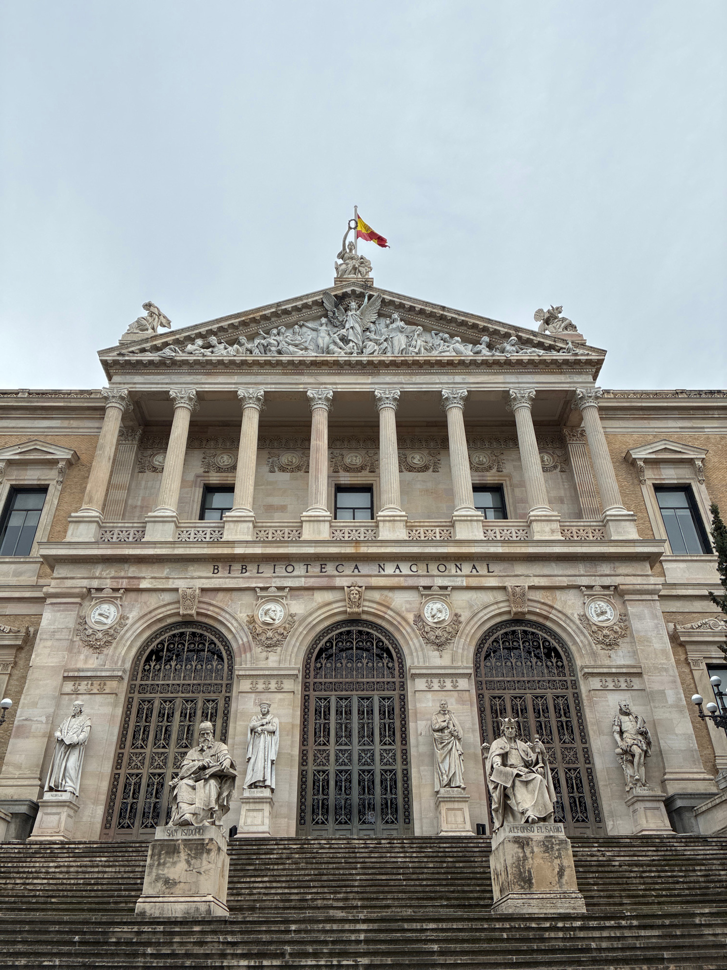The image captures the imposing facade of the Biblioteca Nacional de España (National Library of Spain) in Madrid. The building is constructed of light-colored stone. Its architecture features a class…read more