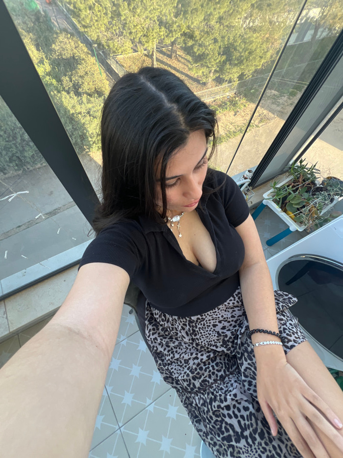 The image displays a female subject captured from an elevated, overhead perspective, seated or leaning indoors in Kiryat Bialik, Israel. She possesses long, dark hair and a light complexion, gazing do…read more