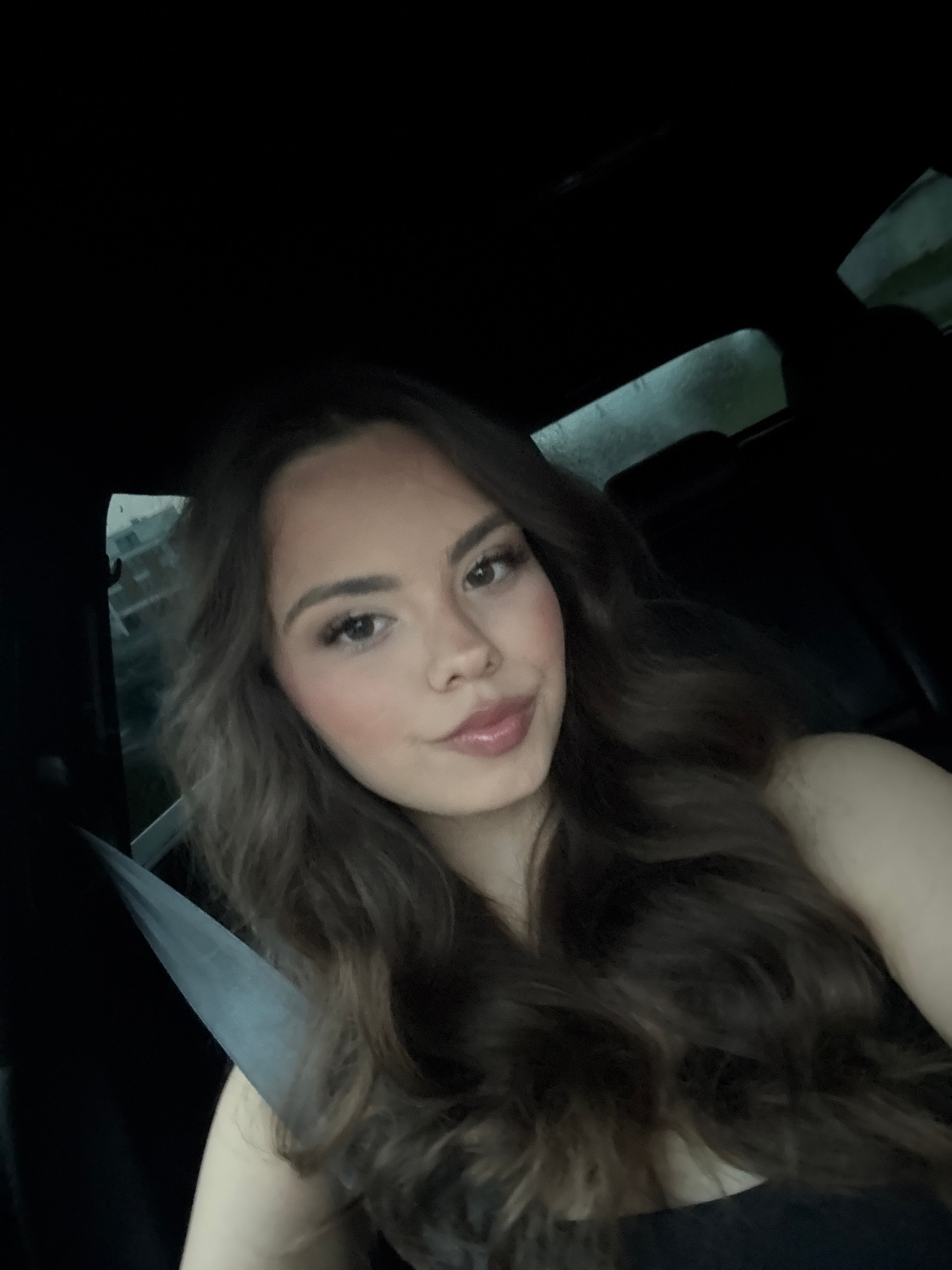 A young woman is in the driver's seat of a car. She is wearing a seatbelt. Her long, wavy brown hair is cascading around her face. The interior of the car appears dark. The photo may have been taken a…read more