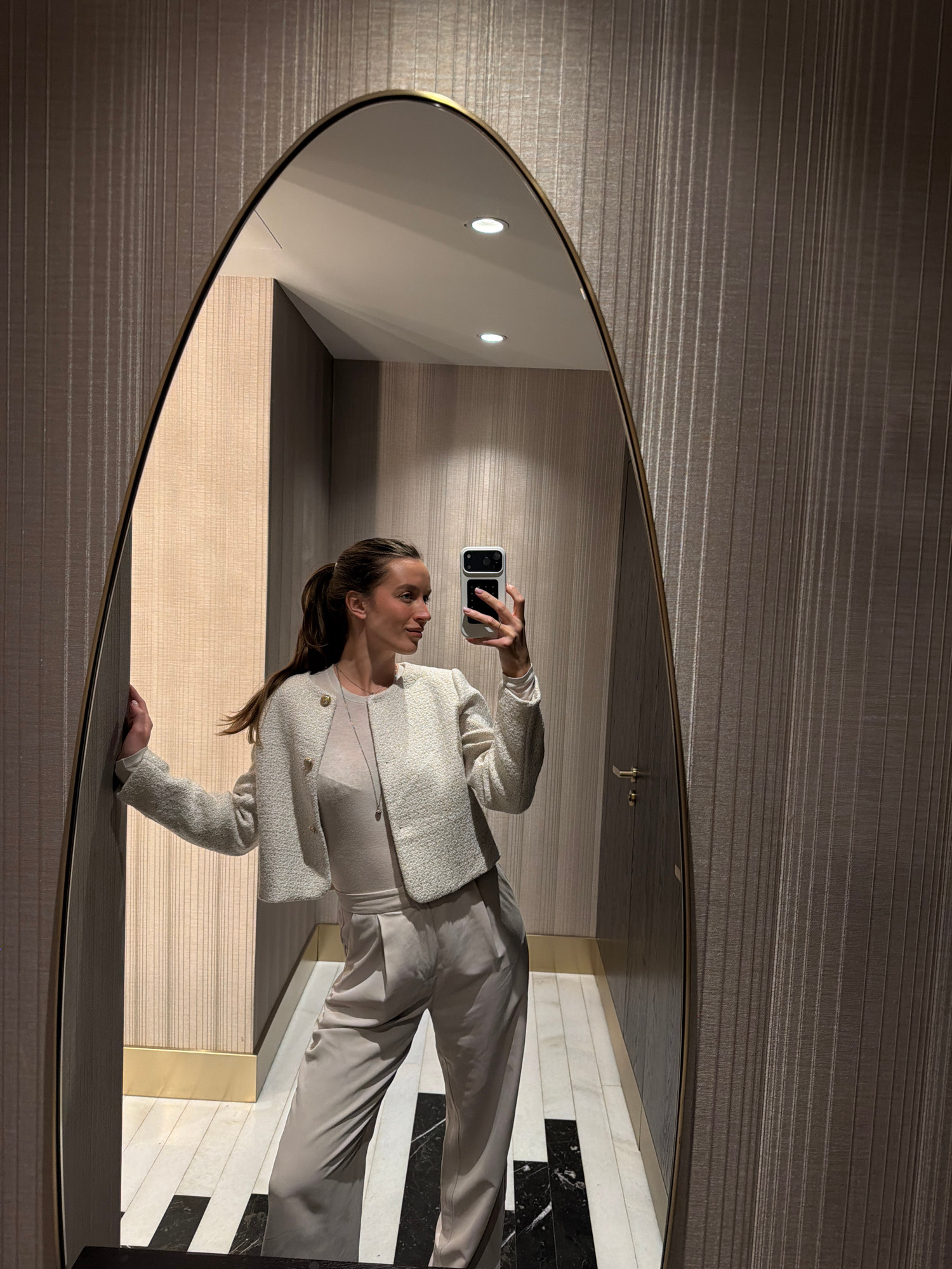 An upright, full-length mirror selfie captures a woman in an elegant indoor setting, likely in Budva, Montenegro. The woman, with long brown hair tied back, is seen from the chest up, looking slightly…read more