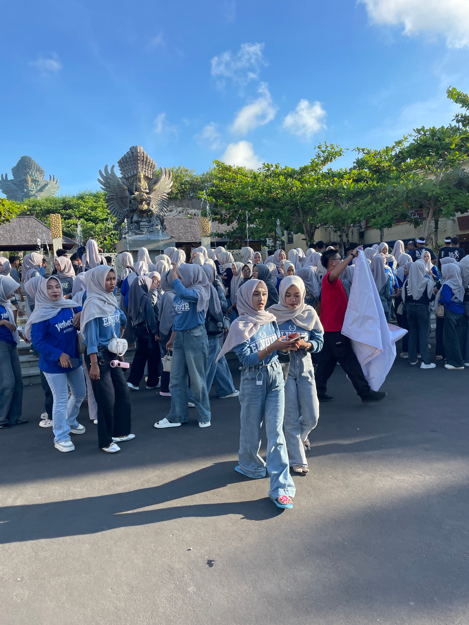 A crowd of people are lined up in Kuta Selatan, Indonesia. Most of the people are wearing a light-colored hijab and a light blue or dark blue sweatshirt, blue jeans, and sneakers. In the background isβ¦read more