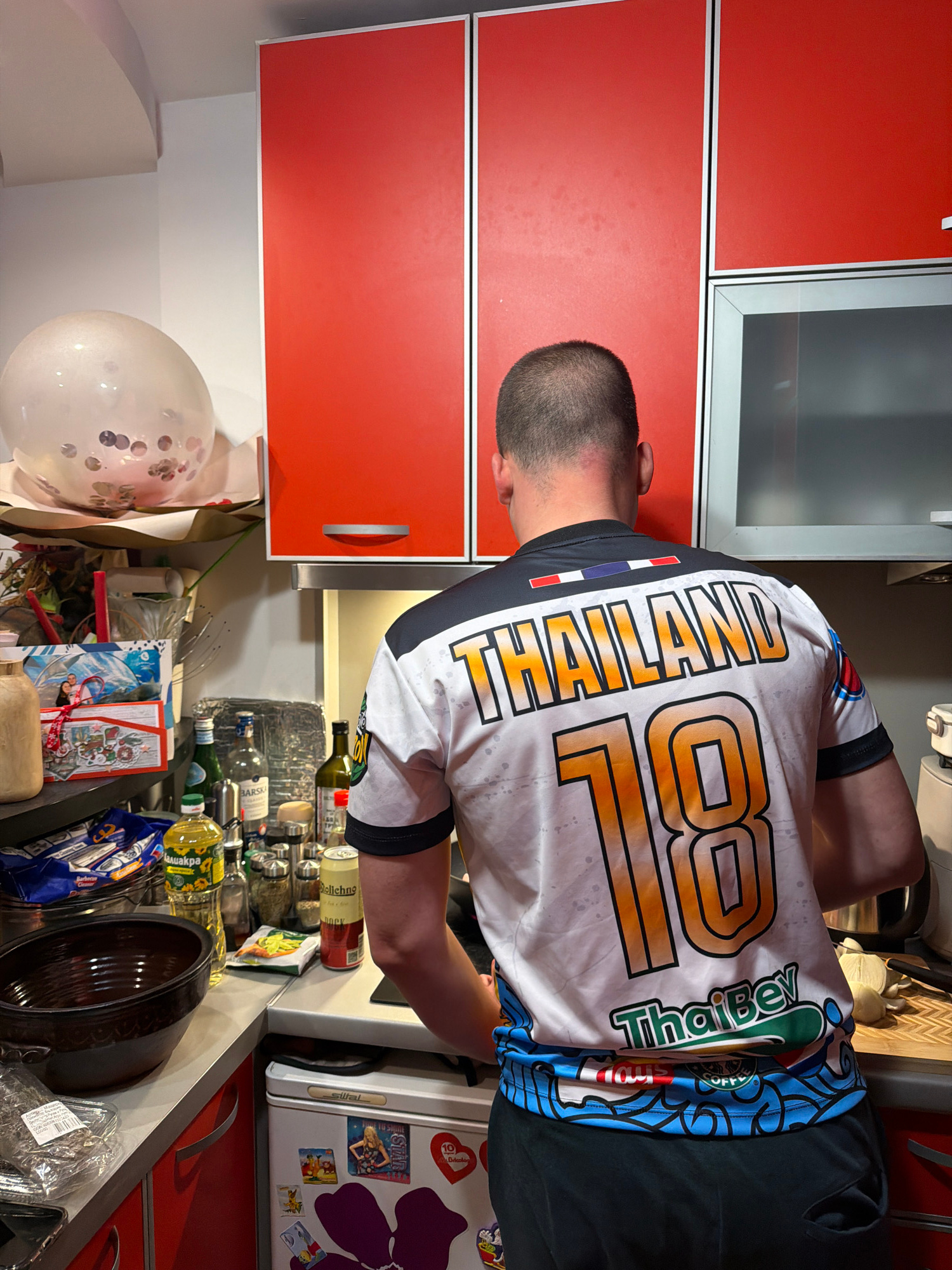 An indoor shot in a kitchen, oriented vertically, shows a person from behind, seemingly engaged in activity at a counter. The individual has short, dark hair and is wearing a white sports jersey with…read more
