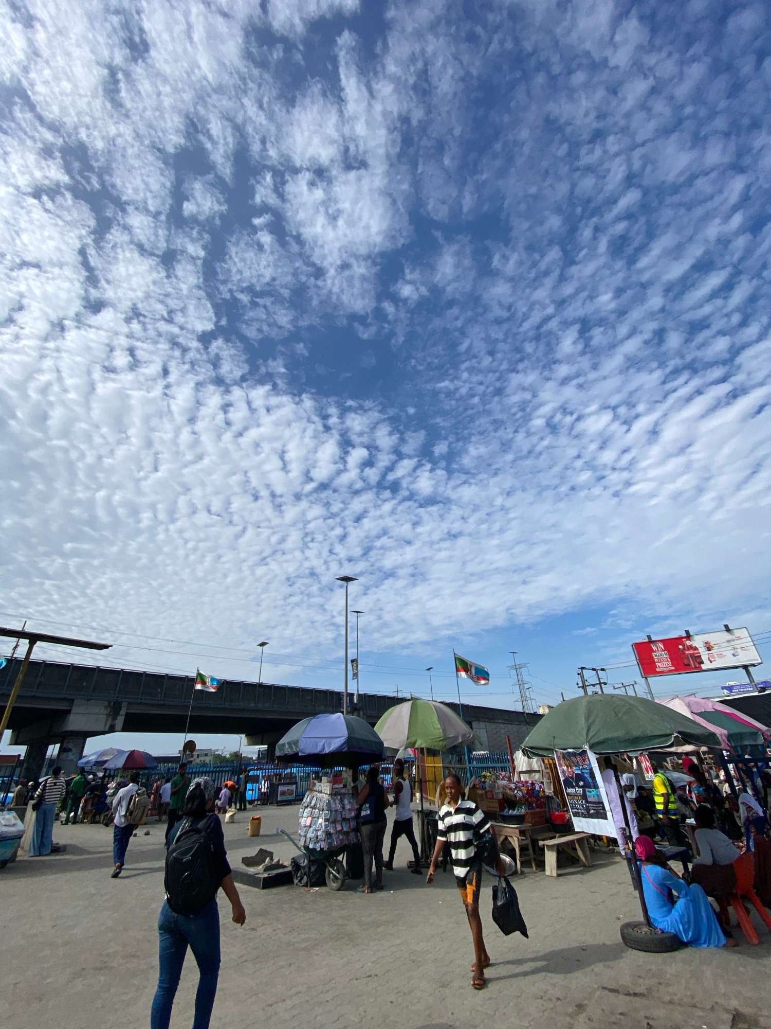 The image shows a street scene in Lekki, Nigeria, with a bustling market under an overpass. The sky above is filled with scattered cumulus clouds. People are walking and interacting with vendors selliβ¦read more